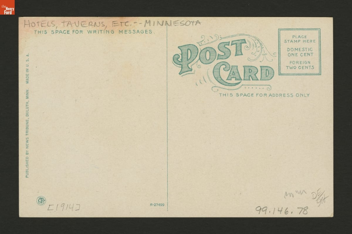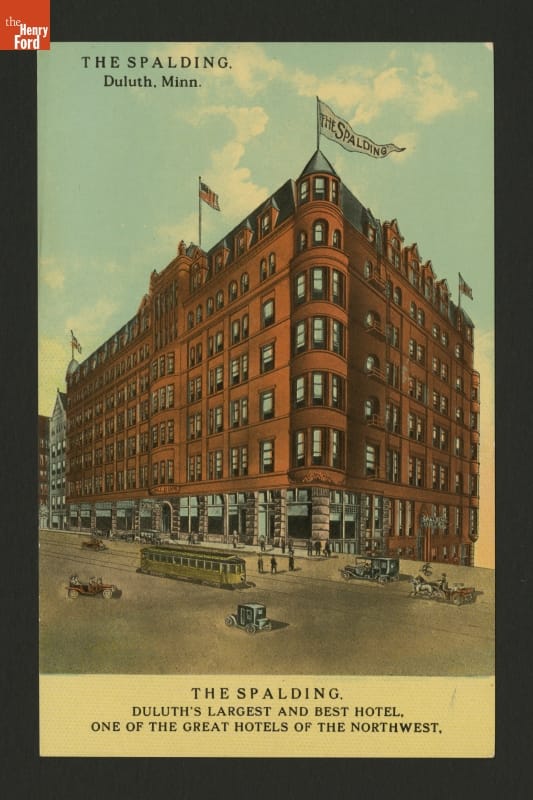 Automobiles, an electric streetcar, a horse-drawn buggy, and pedestrians are seen traveling down the street in front of the Spalding Hotel in Duluth, Minnesota, in this circa 1910 postcard. Proprietors opened the hotel in 1899 to cater mainly to railroad passengers. But by the time this postcard was made, more and more motorists were stopping to use the accommodations.