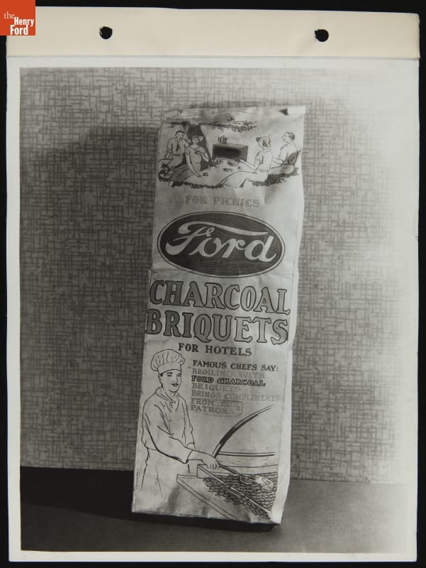 Ford Motor Company manufactured charcoal briquettes from wood wastes generated by its lumber operations in Michigan's Upper Peninsula. This packaging promotes their use as a cooking fuel for family picnics as well as commercial restaurant kitchens. Ford boasted that the hardwood used in its charcoal gave a special aroma and flavor to any foods cooked over it.