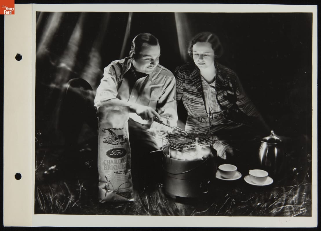 Cars and cookouts were a natural fit in the 1920s and 1930s. As roads improved, Americans were eager to go exploring, whether on short day trips or longer journeys. A roadside picnic saved money for budget-conscious travelers, or it provided a destination in itself for a family on a Sunday drive. Ford used these themes to market its charcoal briquettes.