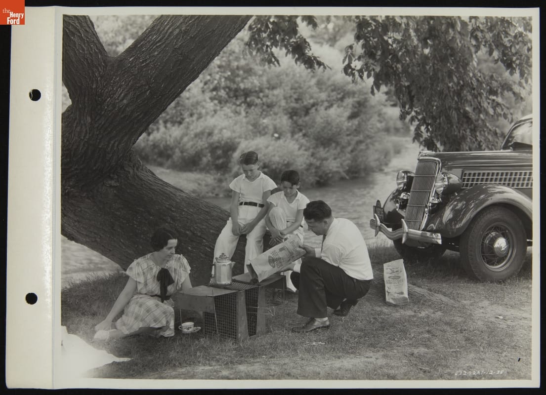 Cars and cookouts were a natural fit in the 1920s and 1930s. As roads improved, Americans were eager to go exploring, whether on short day trips or longer journeys. A roadside picnic saved money for budget-conscious travelers, or it provided a destination in itself for a family on a Sunday drive. Ford used these themes to market its charcoal briquettes.