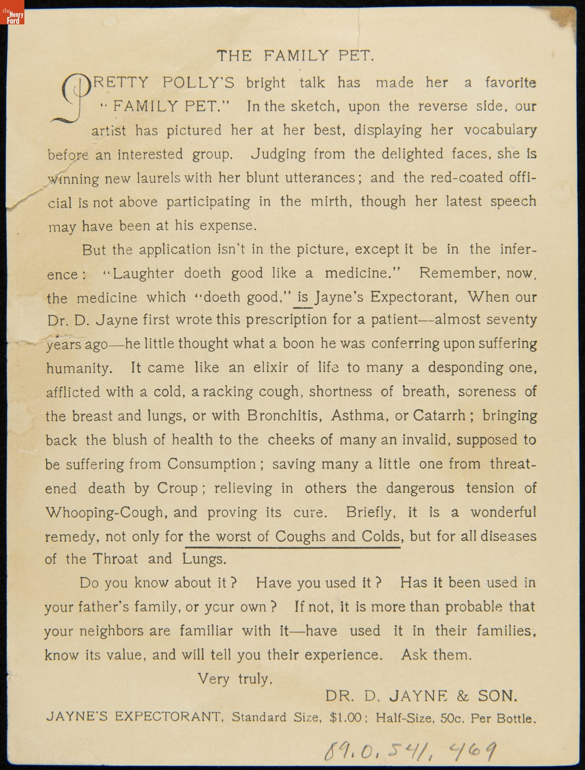 Trade Card for Dr. Jayne's Patent Medicines, "The Family Pet," 1880-1900