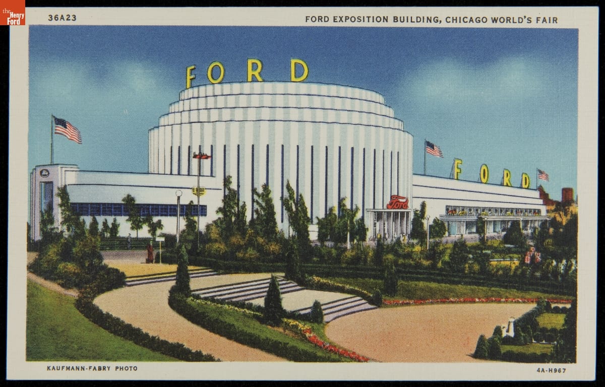 Chicago's 1933-34 Century of Progress Exposition used the theme of progress to encourage optimism during the Depression. This postcard depicts Ford Motor Company's 1934 exhibition building, which featured a central Rotunda designed to simulate graduated clusters of gears. After the fair, this building became an attraction at Ford headquarters in Dearborn, Michigan, until it burned down in 1962.