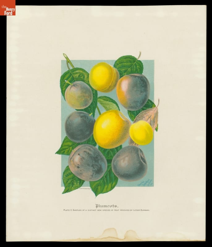 Lithograph, "Plumcots, Samples of a Distinct New Species of Fruit Produced by Luther Burbank" 1909