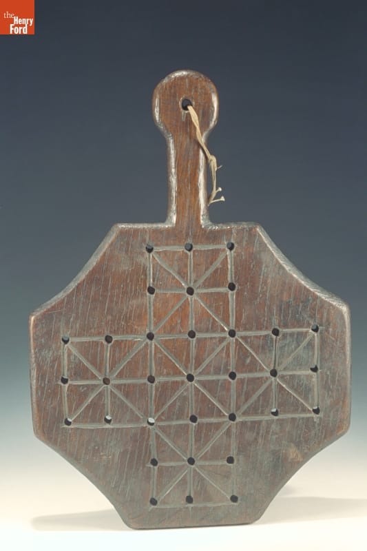 This octagonal-shaped wooden game board was likely used for the game "Fox and Geese," which poses one fox against 13 geese. The geese move one space at a time, with the goal of surrounding the fox. The fox can capture geese by jumping them one at a time, with the goal of removing enough so he cannot be surrounded.