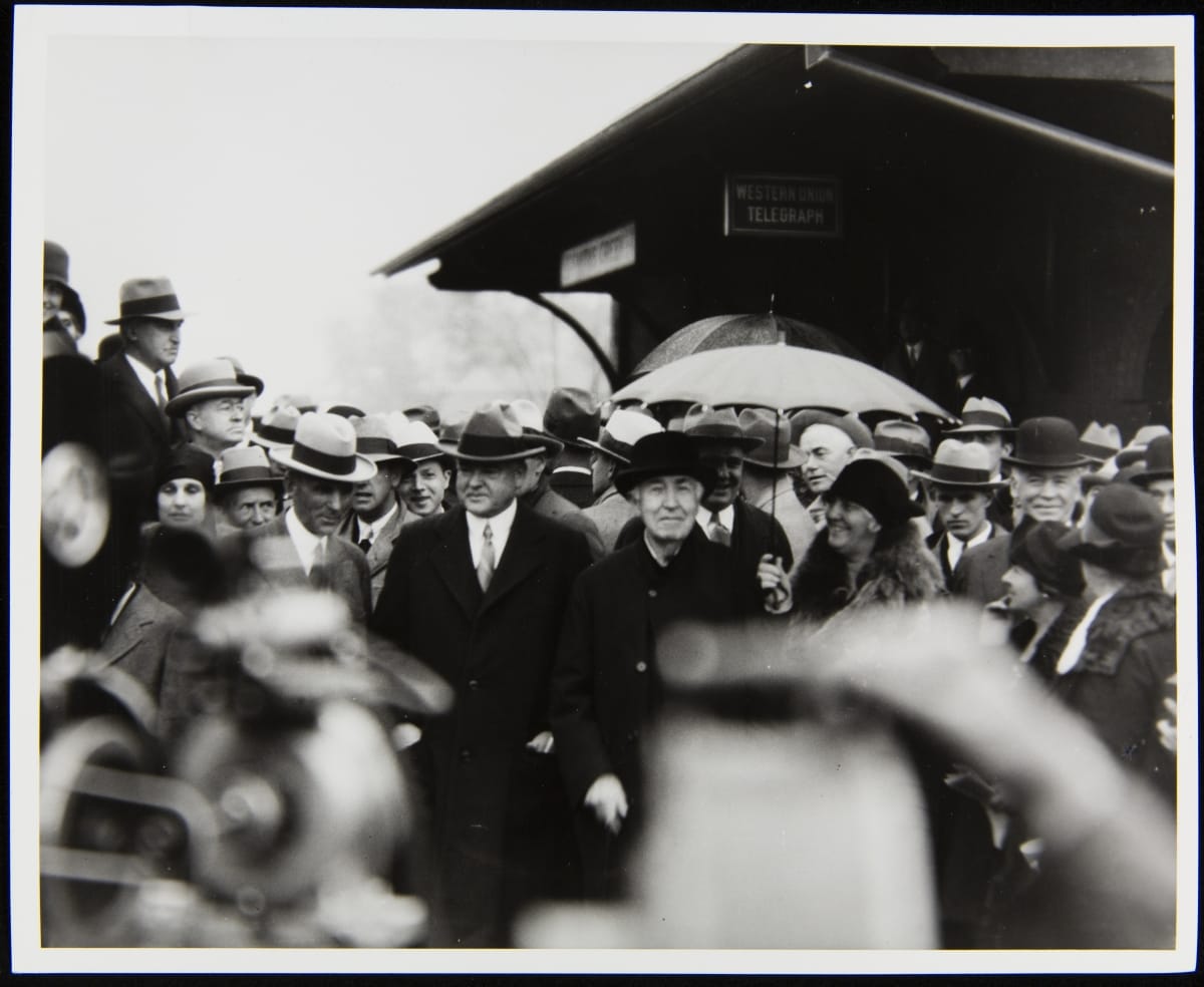 Henry Ford, President Herbert Hoover, Thomas Edison, and Lou Henry Hoover at Smiths Creek Station, October 21, 1929
