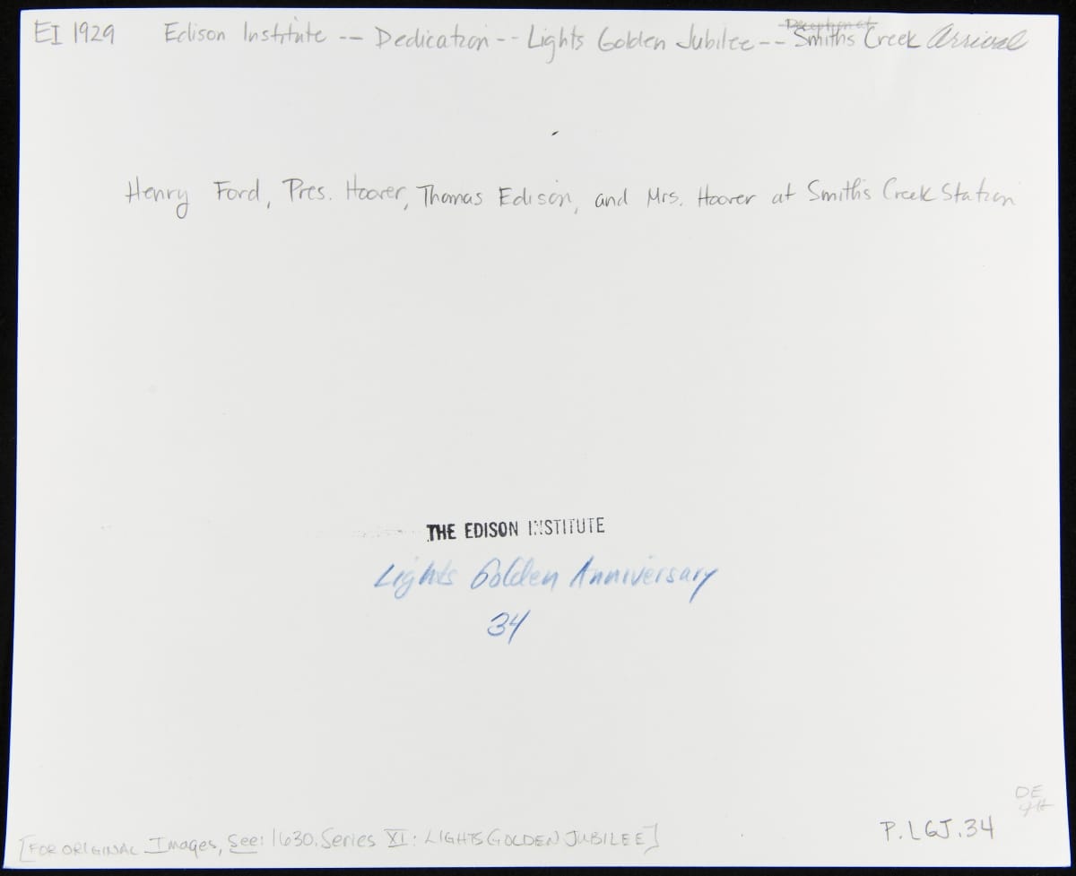 On October 21, 1929, Henry Ford hosted an elaborate celebration in Dearborn, Michigan, to honor his friend Thomas A. Edison. Known as Light's Golden Jubilee, the date marked the 50th anniversary of Edison's invention of a practical incandescent lamp. The day's festivities began with Edison's arrival -- escorted by Ford and President Hoover -- at Smiths Creek Station in Ford's Greenfield Village.
