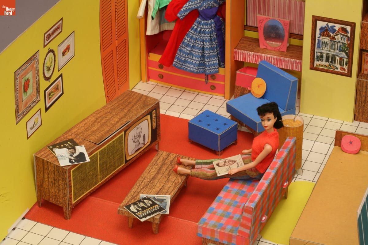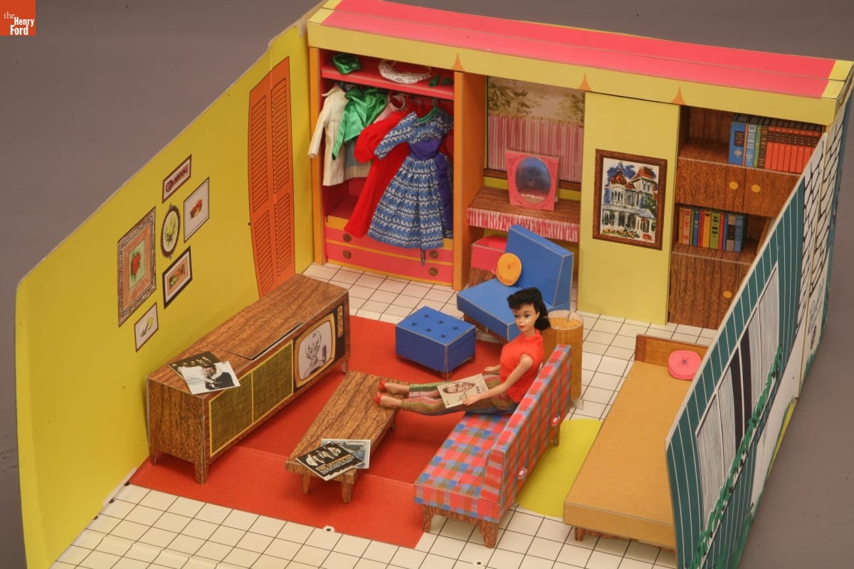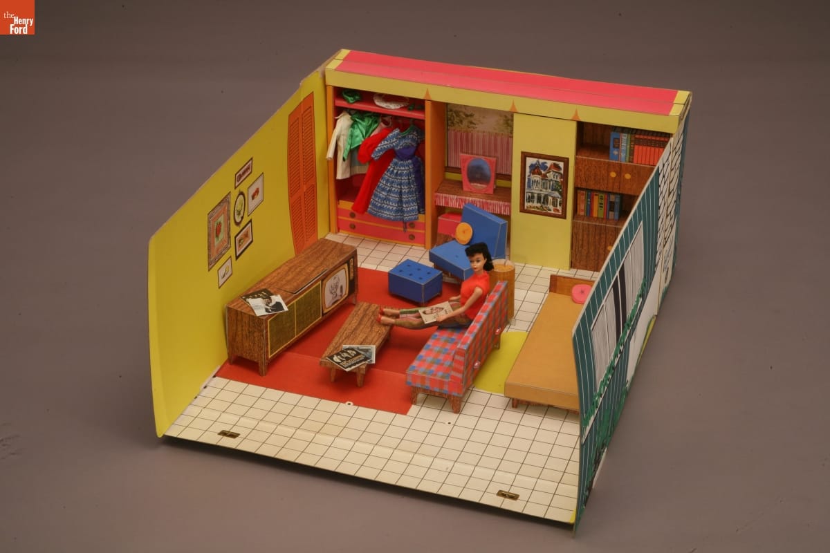 By the early 1960s, Barbie dolls could have play environments, including this Barbie Dream House. Introduced in 1962, the Barbie Dream House was filled with sleek, modern furniture that included a combination television/stereo console. While relaxing in her very own "space," Barbie could watch herself on television or listen to albums by Nat King Cole, Frank Sinatra, or the Lettermen.