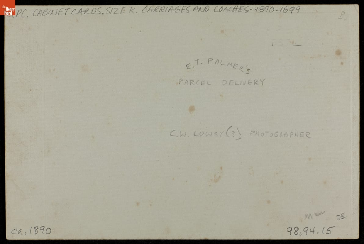 Professional photographers began producing cabinet cards in 1867, and people soon preferred these photographic prints on cardboard stock to the earlier, smaller cartes-de-visite. American commonly collected and exchanged cabinet photographs through the early 1900s. This example, made by C. W. Lowry around 1890, shows a man near a horse-drawn "Parcel Delivery" wagon.