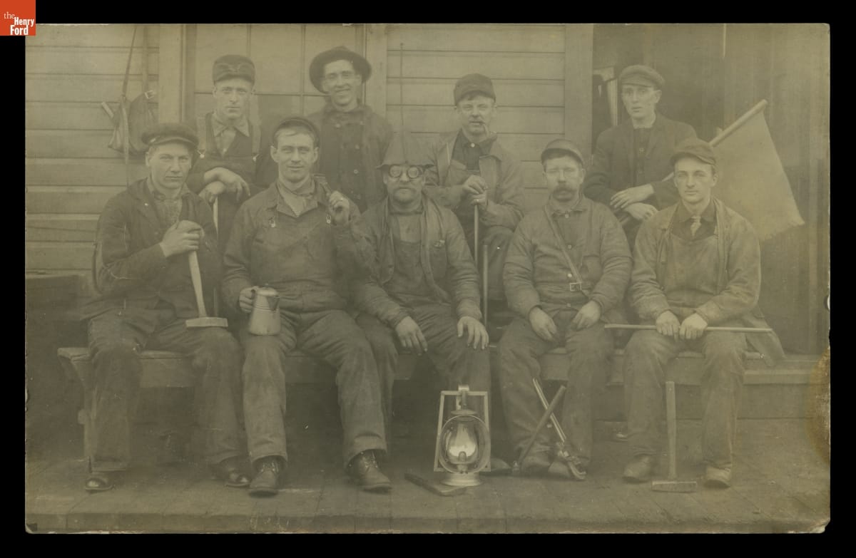 Nine railroaders posed with some of their tools for this scene captured at East Altoona, Pennsylvania, circa 1895. Altoona was home to the Pennsylvania Railroad's Altoona Works -- its main locomotive and car shops -- and was a classic railroad town heavily dependent on rail-related jobs. At its peak in the 1920s, the Altoona Works employed 15,000 of the city's 60,000 residents.