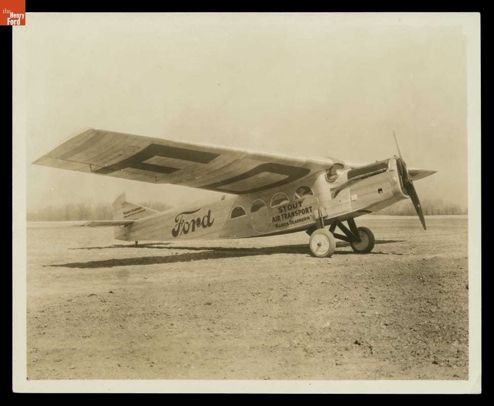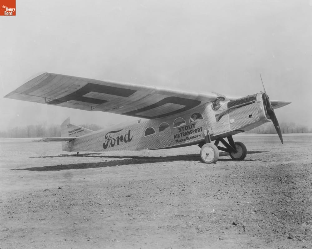 The Stout 2AT airplane, designed by William B. Stout, first flew in February 1924. It had a cruising speed of 100 miles per hour, a range of 500 miles, and a capacity of six passengers or 1,500 pounds of freight. The plane in this photo was the first built at Stout's factory in Dearborn -- which explains its pun name, Maiden Dearborn.