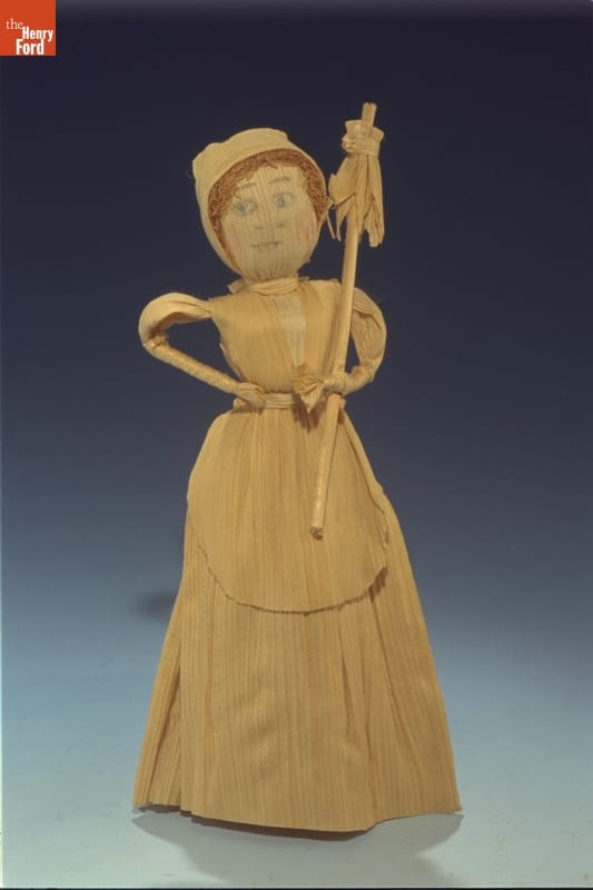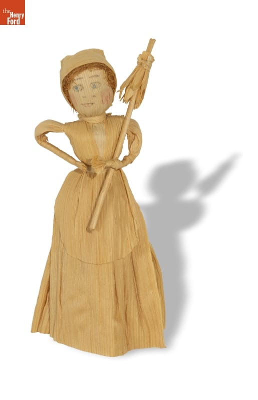 By 1920, more Americans lived in cities than on farms, and most things were made in factories by machines. People began to appreciate traditional crafts made by hand. During this Craft Revival of the 1920s and 1930s, cornhusk dolls enjoyed renewed popularity. This doll has corn silk hair and holds a cornhusk parasol.