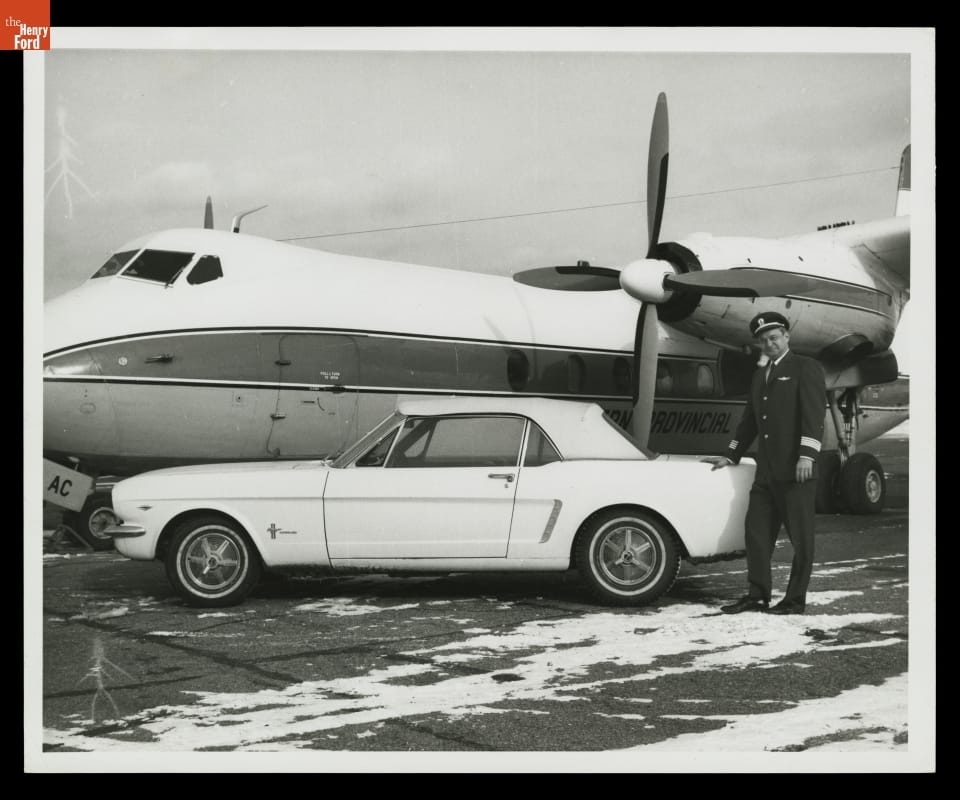Ford Mustang serial number 1 rolled off the assembly line in March of 1964 and embarked on a Canadian publicity tour. It was purchased by airline pilot Captain Stanley Tucker in Newfoundland on April 14 -- three days before the 1965 Mustang was introduced to the public. In this photograph, Captain Tucker poses with his Wimbledon White convertible.