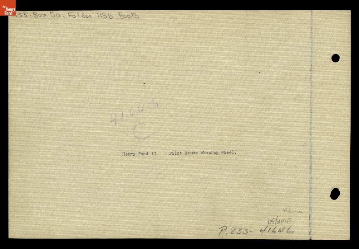 Henry Ford had two ore freighters built in 1924 and named them after his grandsons -- Henry Ford II and Benson Ford. The ships plied the Great Lakes, transporting raw materials and finished products to and from Ford's River Rouge manufacturing complex. This photograph shows the wheelhouse or pilot-house of the Henry Ford II. The wheelhouse contains navigational equipment used by the ship's captain and crew.