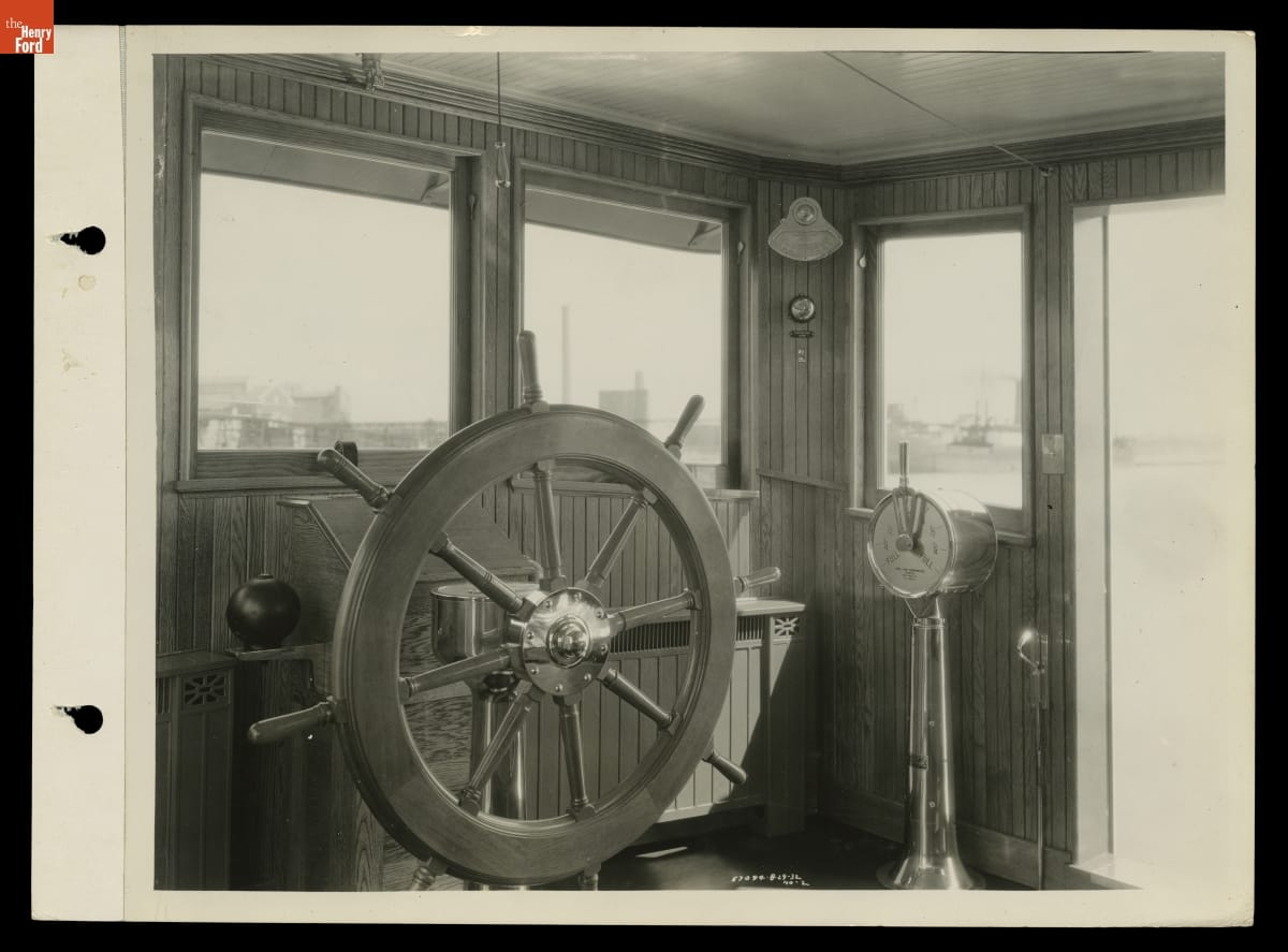 Henry Ford sited his new manufacturing complex on the newly dredged River Rouge to accommodate ships bringing in raw materials or taking on finished product for delivery. Desiring complete self-sufficiency at the Rouge, Ford assembled his own fleet of cargo carriers, ocean freighters, barges, tugboats and canal boats. This photograph shows the pilothouse of the Ford Motor Company tugboat Dearborn.