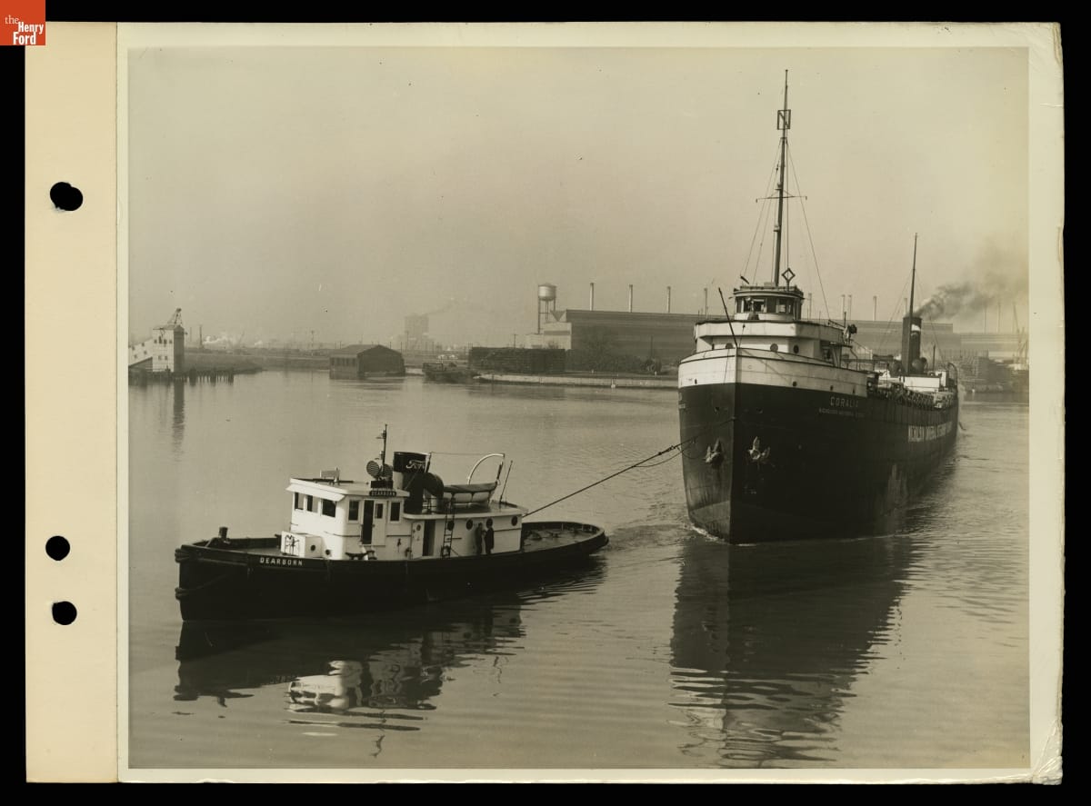 The Coralia, originally launched in 1896 as a Great Lakes bulk freighter, was converted into an auto carrier in the late 1920s. This photograph shows the Coralia towed by the Ford Motor Company's tugboat Dearborn. The Dearborn worked mainly in the Ford Rouge plant's harbor, shuttling barges between the harbor and the Rouge River proper.