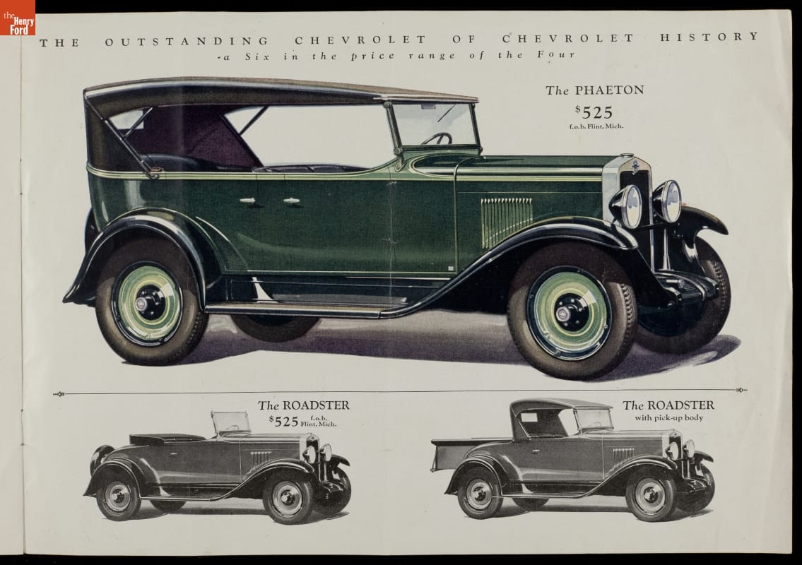 Chevrolet introduced its 1929 line of low-cost vehicles with its new six-cylinder engine in this catalog. The engine was a direct challenge to Ford's four-cylinder Model A. Drivers could now afford a powerful six-cylinder vehicle "in the price range of the four!"