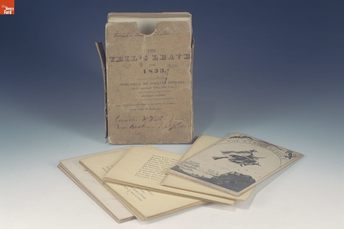 This set of cards contains poetic verses that contain harmless prophesies. Partygoers in the 1830s used this deck as a form of an evening's entertainment. Players would read the printed verses and probably discuss their meaning or laugh at their (in)accuracies. Plain white cards contained predictions for men; colored cards contained ones for women.