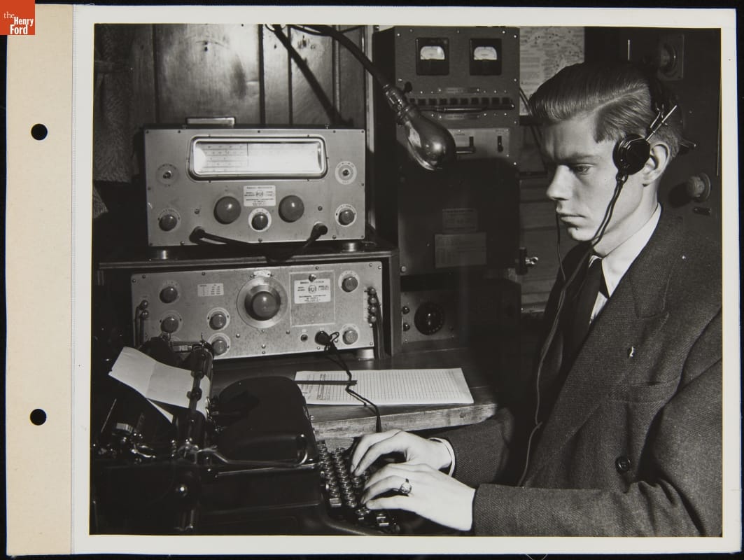 Radio Operator at a Typewriter aboard the Ford Motor Company Ship, "Benson Ford," April 1945