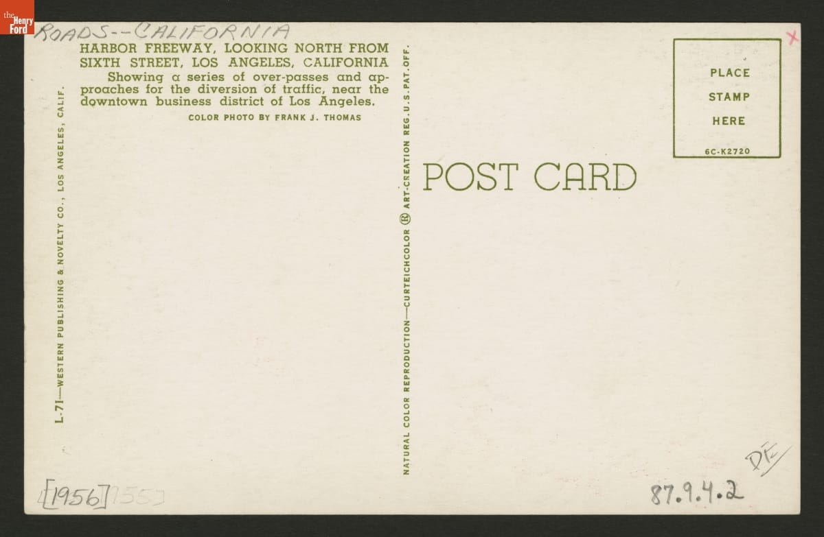 Few American cities embraced the automobile like Los Angeles. The southern California metropolis opened the first of its many limited-access freeways in 1940. Work on the Harbor Freeway, seen here, began in the early 1950s. Now designated Interstate 110, this freeway connects the downtown area with the Port of Los Angeles to the south, and with Pasadena to the northeast.