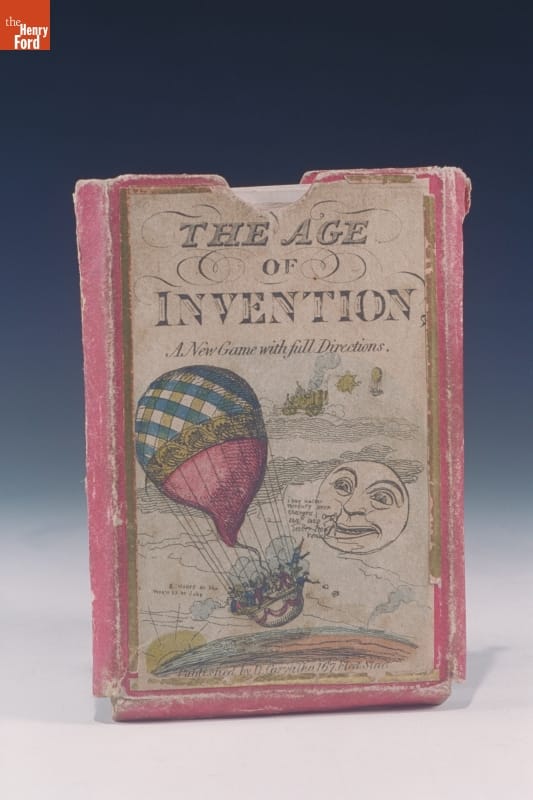 This box contained a set of printed cards with images of early-19th century events and inventions. Each card was given a value, and those of higher value trumped all others. Players could be entertained by either playing the game or discussing the colorful illustrations of history and innovation.