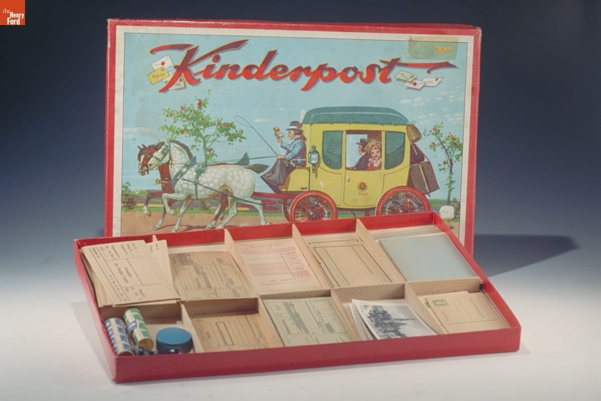 At the turn of the twentieth century, children could imagine they ran a post office with this play set. Inside the box children found stamps, postcards, telegrams, mailing labels and other materials similar to those used in an adult post office. This role-playing provided children with valuable learning experiences and helped them develop social skills.
