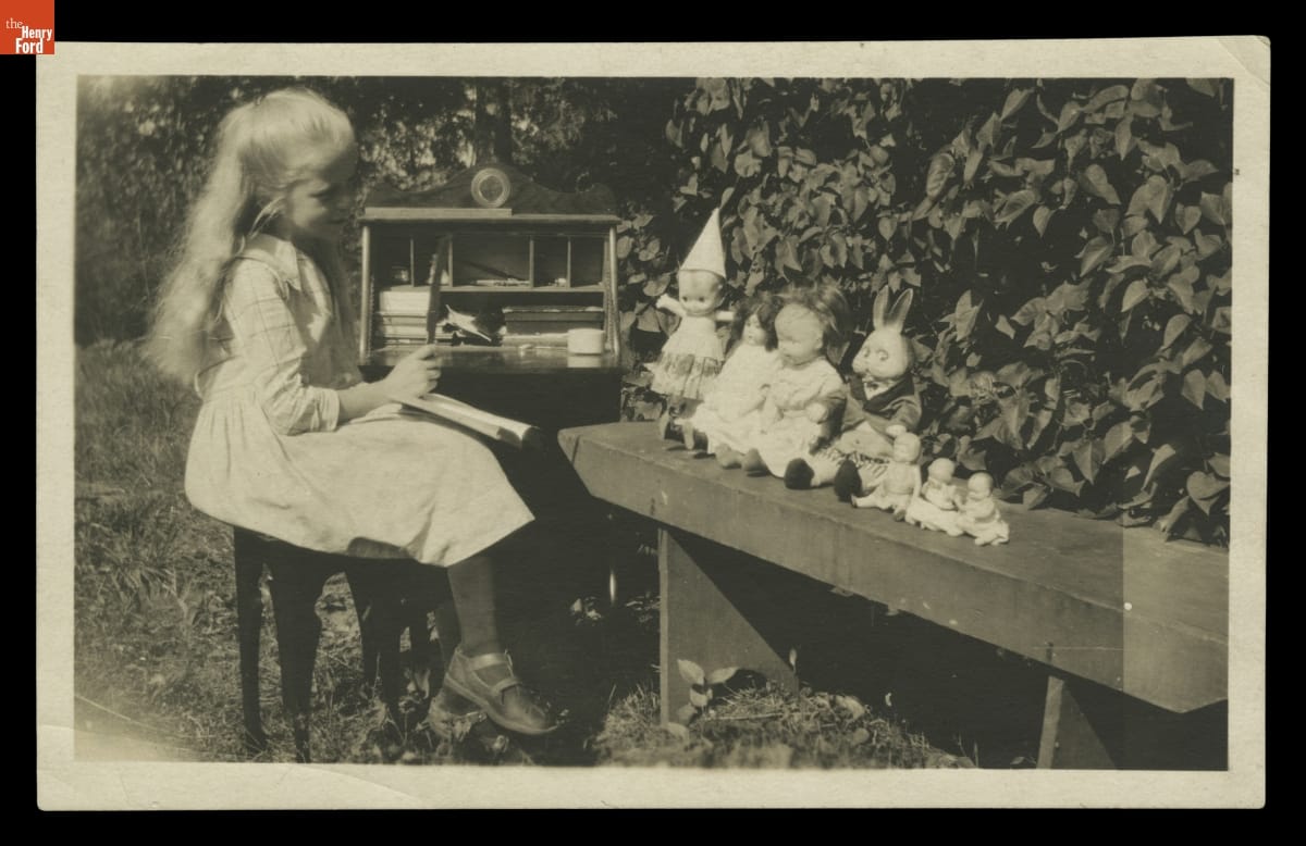 Young Girl Playing School with Dolls and a Peter Rabbit Stuffed Toy, circa 1920