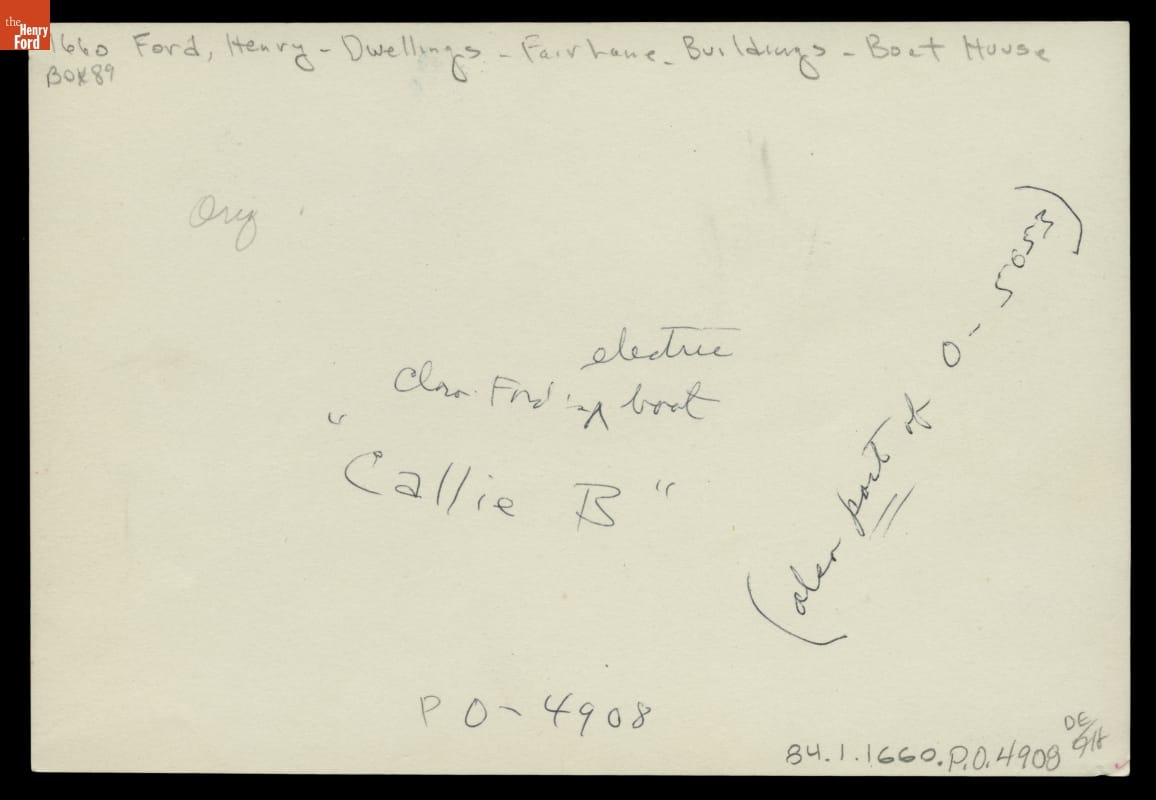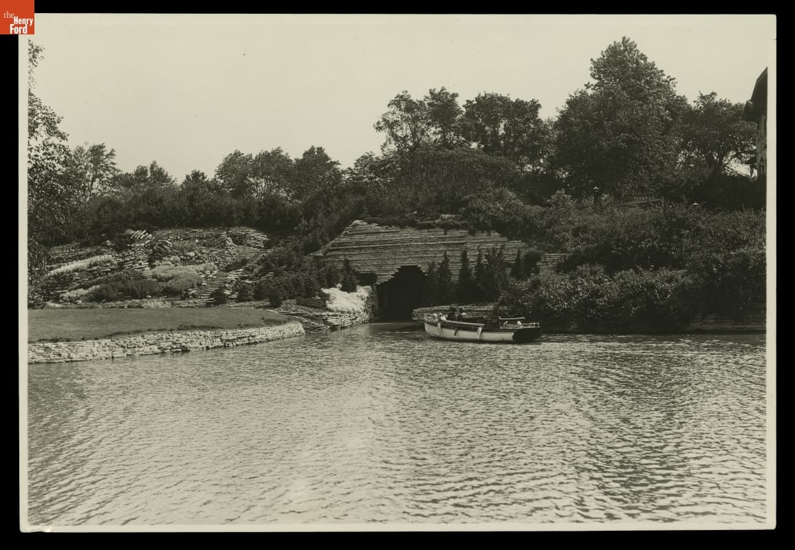 Clara Ford pilots her electric boat, Callie B., on the Rouge River in Dearborn, Michigan. Callie was the affectionate nickname given by Henry Ford to his wife. Mrs. Ford kept her mahogany boat in an underground boathouse next to the couple's residence at Fair Lane Estate.