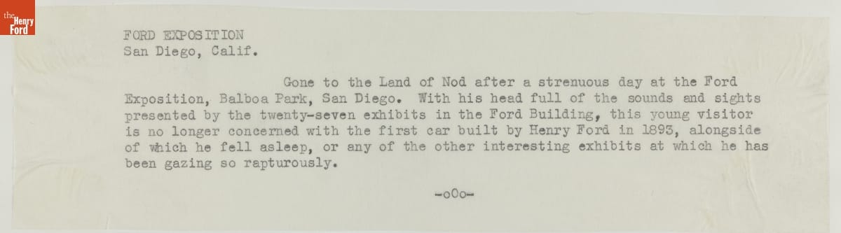 Through the 1930s, Ford Motor Company poured resources into exhibitions at regional and world's fairs. Henry Ford believed strongly in the educational value of such displays, and a corporate presence at the fairs benefitted public relations. Henry Ford's first car, the Quadricycle, was exhibited for visitors in the 1935 California Pacific International Exposition Ford Building.