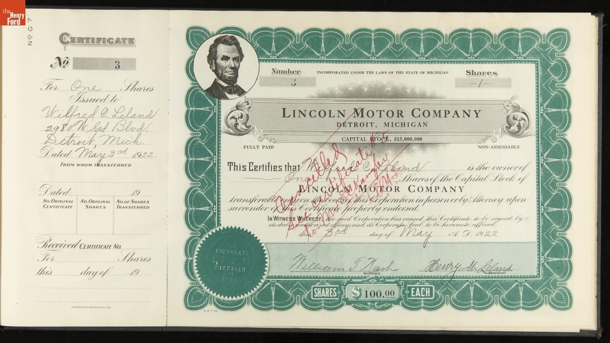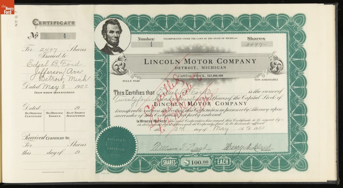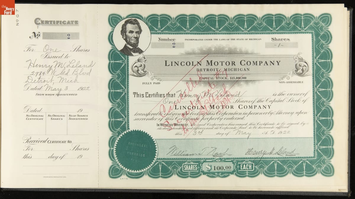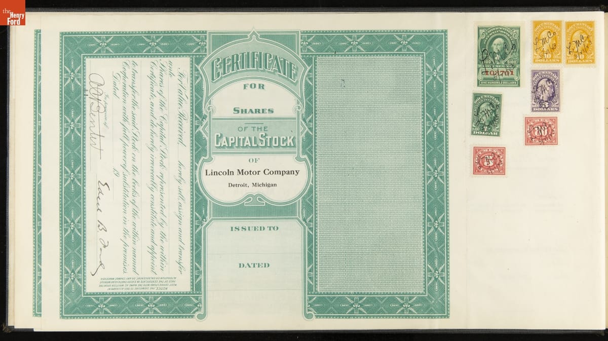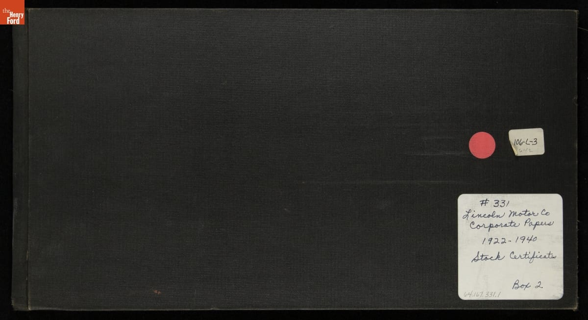 Lincoln Motor Company Stock Certificate Book, 1922-1926