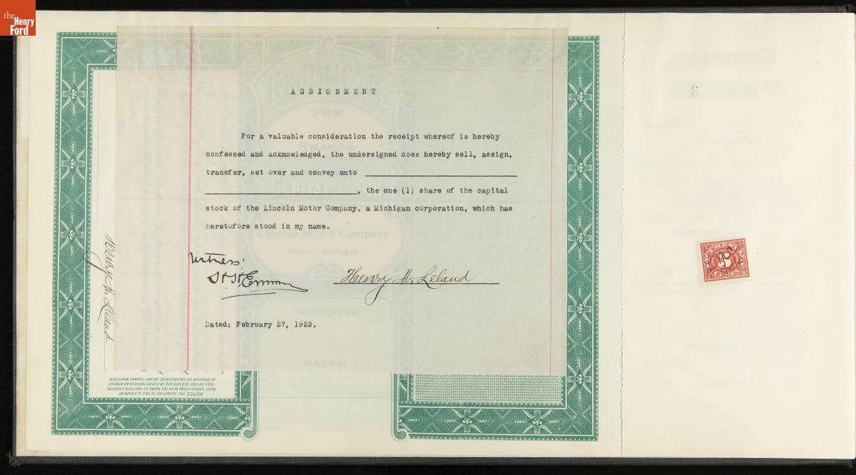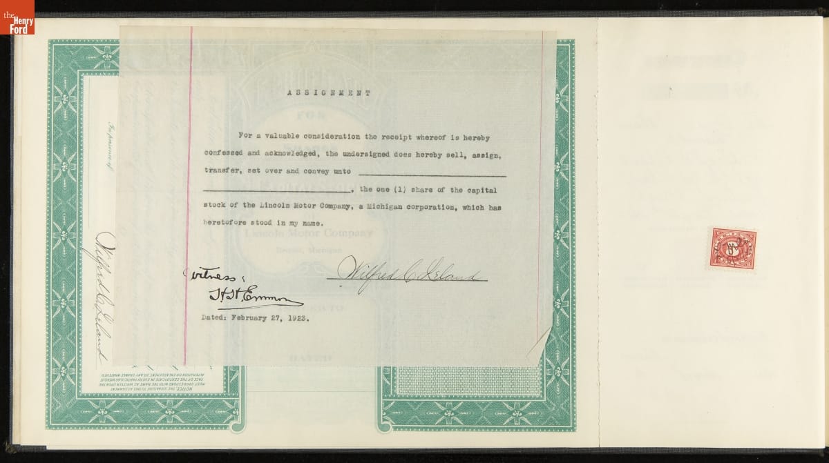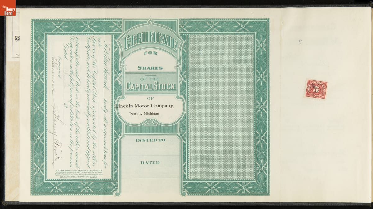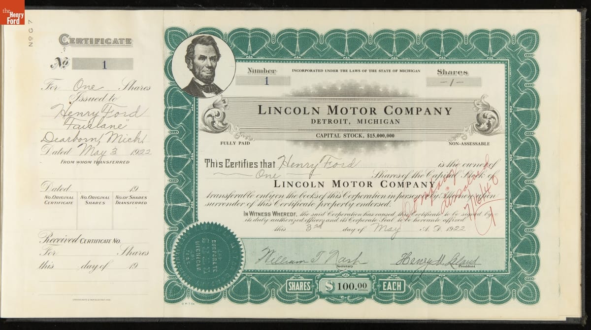 On Henry Ford's share certificate: Company dissolved 7/16/1940 T /.