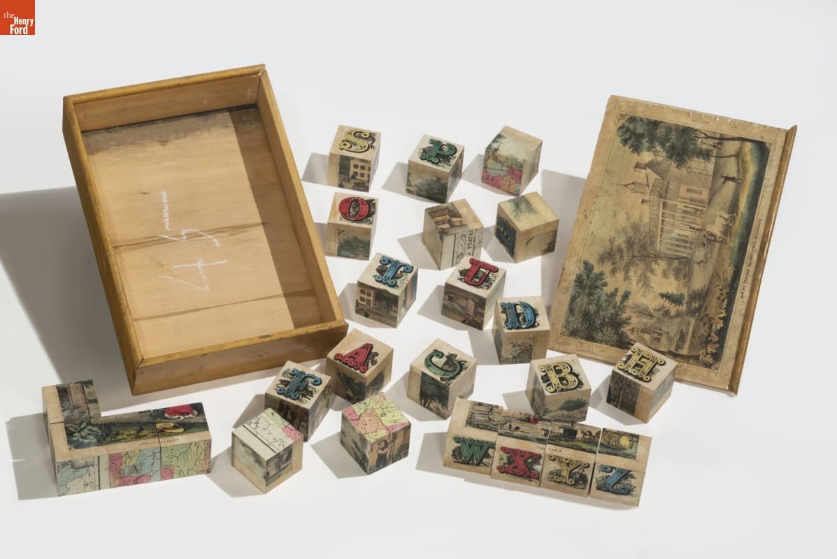 Toy manufacturers designed puzzles for older children and adults. One form -- cubes with pictures on each face -- challenged users with the possibility of multiple solutions. This set of 24 wooden blocks could be combined to create one of six illustrated scenes, a map of the United States, or the alphabet.