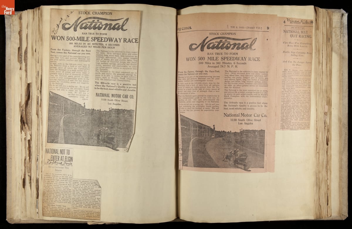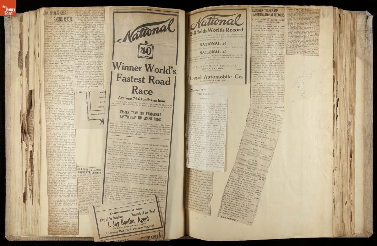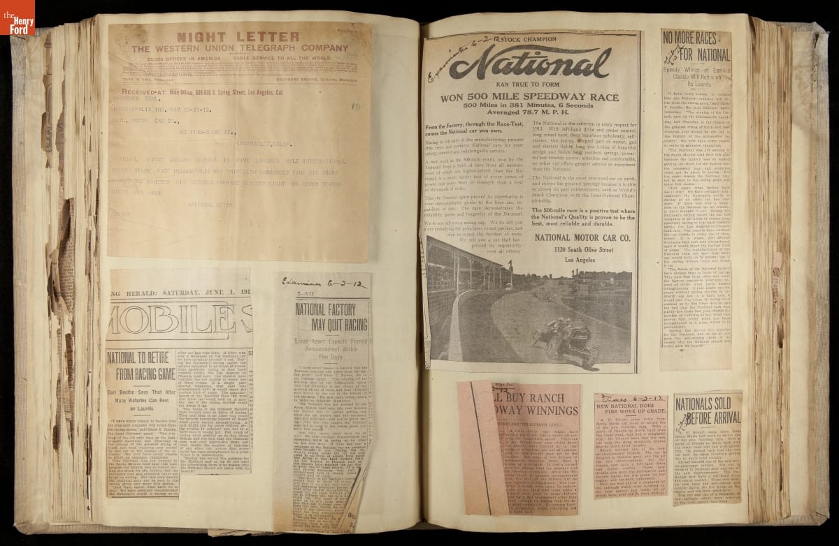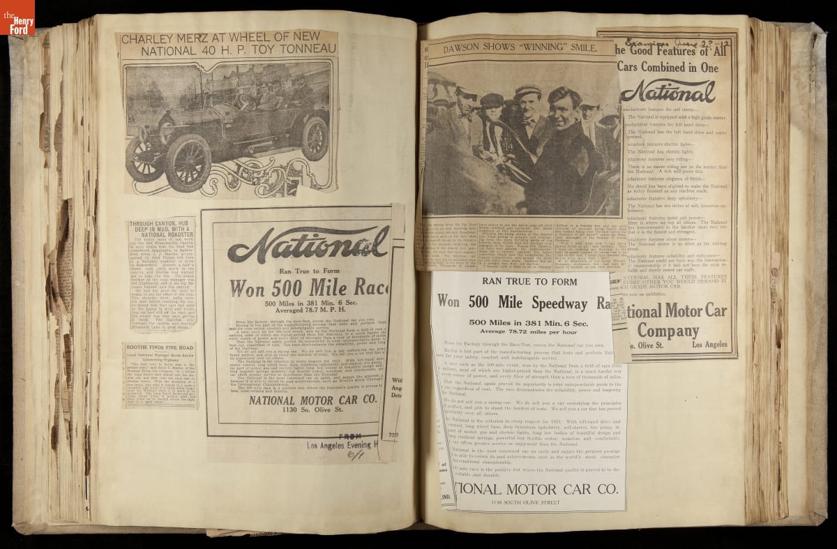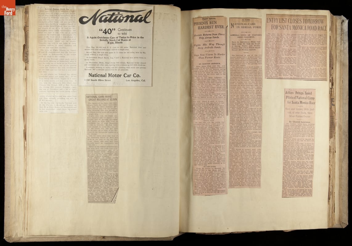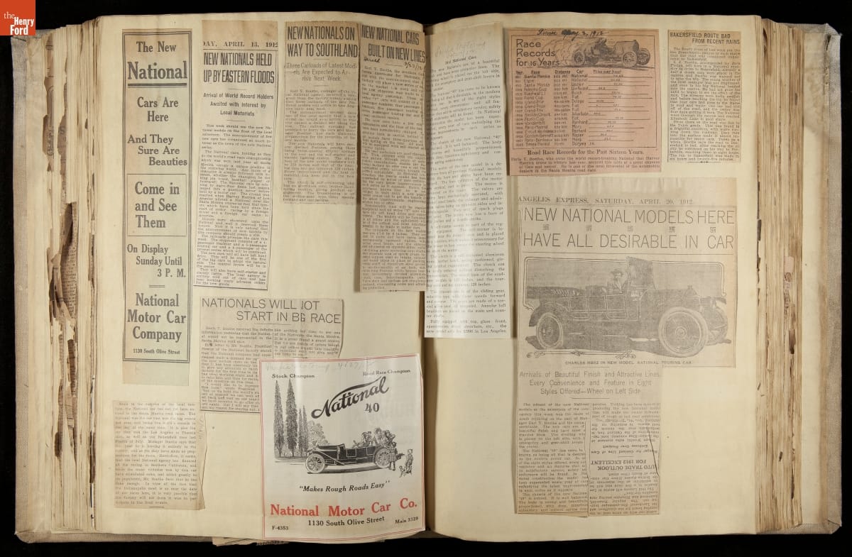 National was formed in Indianapolis in 1900 as a maker of electric cars, but it transitioned to gasoline six years later. The company had an active racing program. This scrapbook, assembled by a distributor in Los Angeles, tracked National's motorsport successes. The company's annual production peaked at something over 1,800 cars in 1915. National ended operations in 1924.