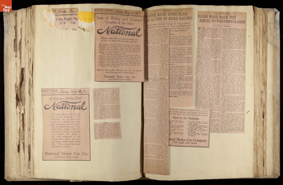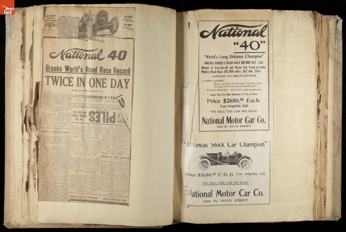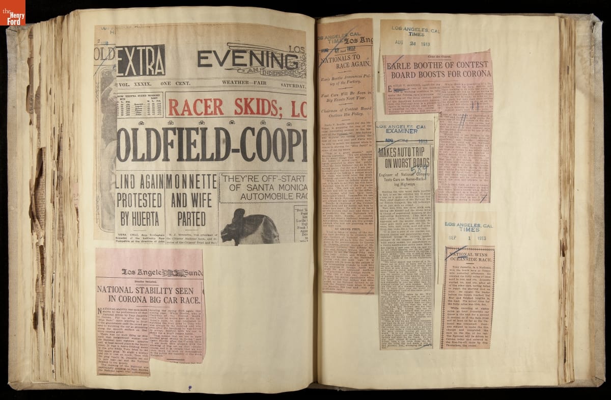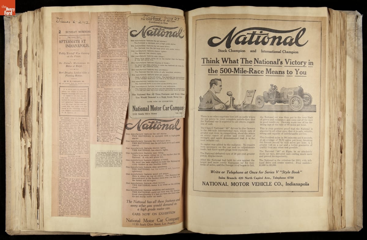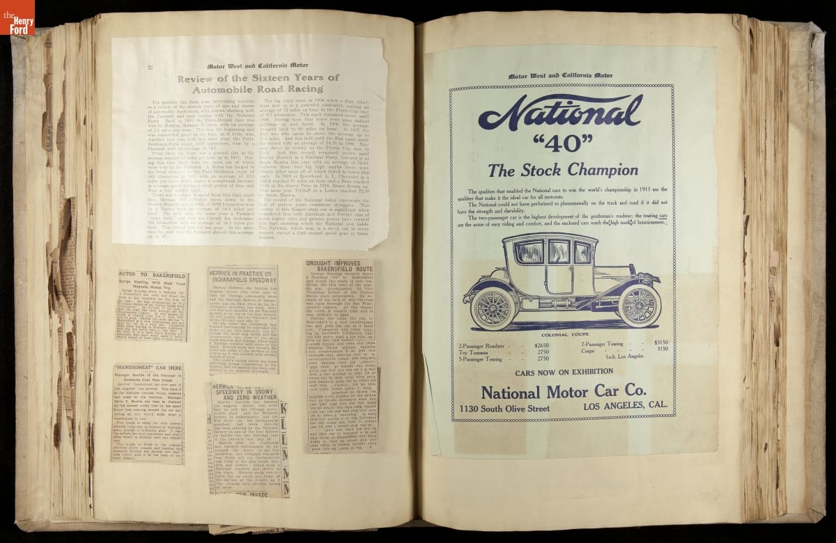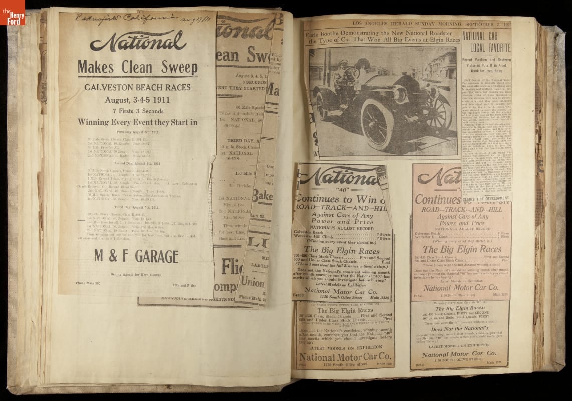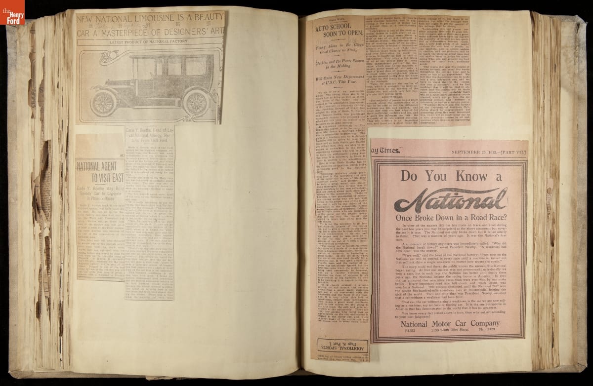 National was formed in Indianapolis in 1900 as a maker of electric cars, but it transitioned to gasoline six years later. The company had an active racing program. This scrapbook, assembled by a distributor in Los Angeles, tracked National's motorsport successes. The company's annual production peaked at something over 1,800 cars in 1915. National ended operations in 1924.