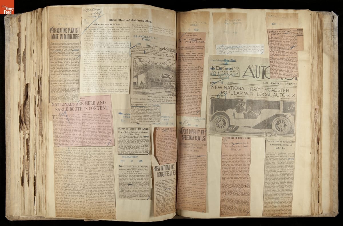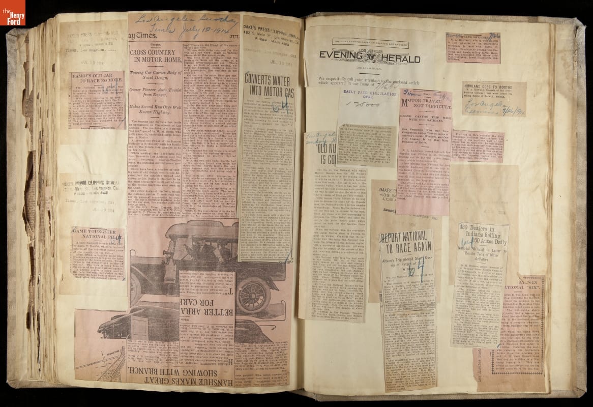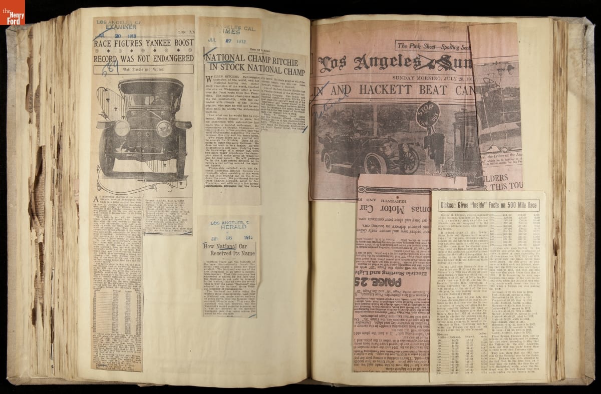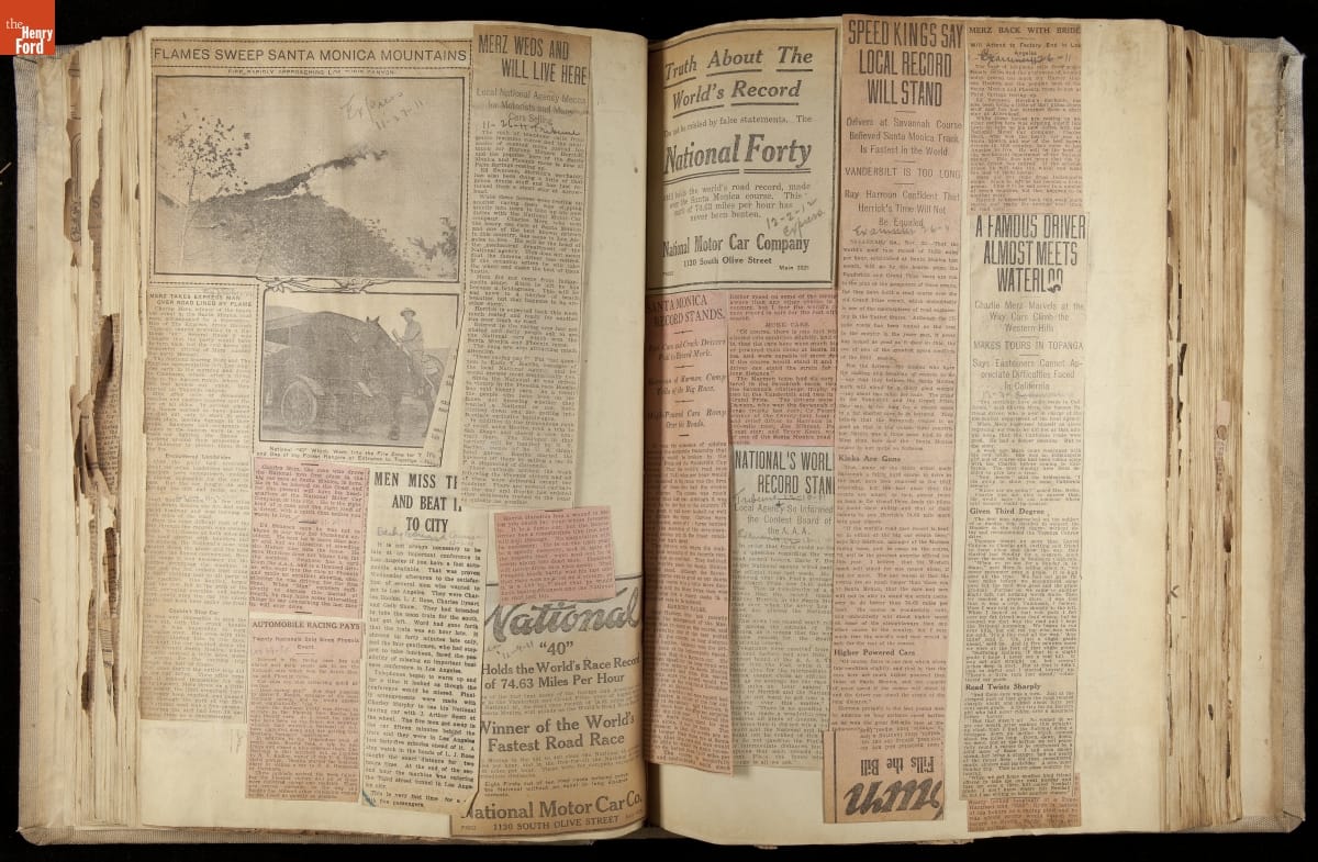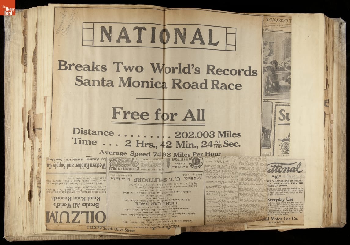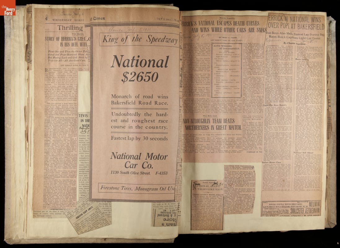 National was formed in Indianapolis in 1900 as a maker of electric cars, but it transitioned to gasoline six years later. The company had an active racing program. This scrapbook, assembled by a distributor in Los Angeles, tracked National's motorsport successes. The company's annual production peaked at something over 1,800 cars in 1915. National ended operations in 1924.