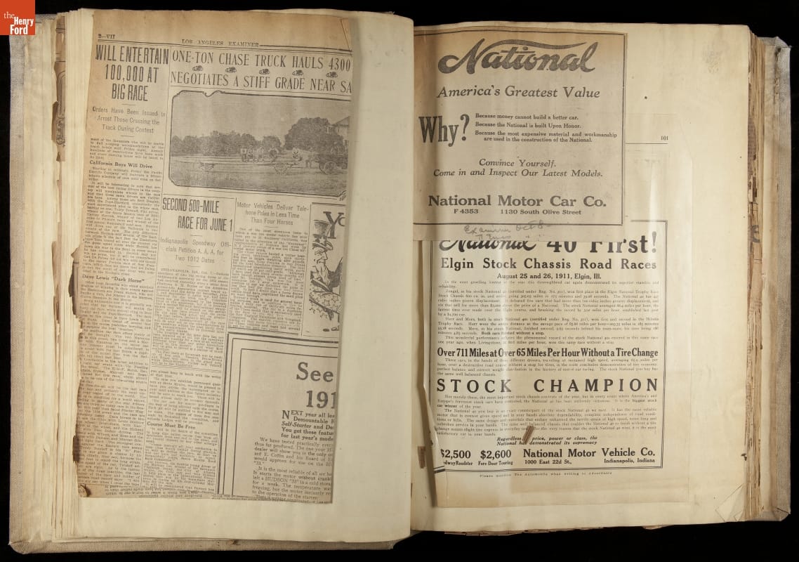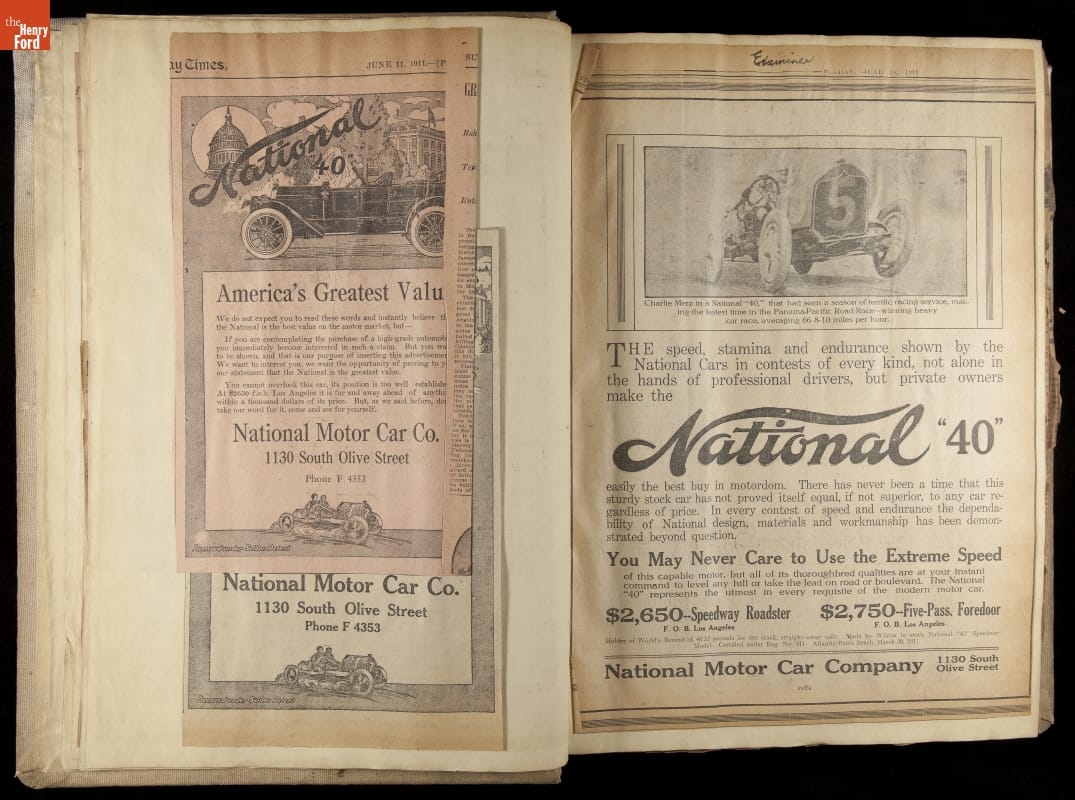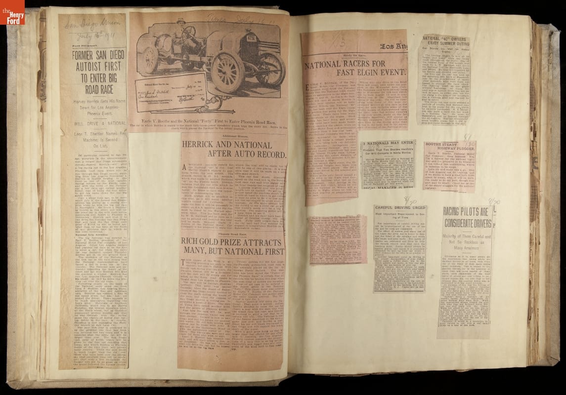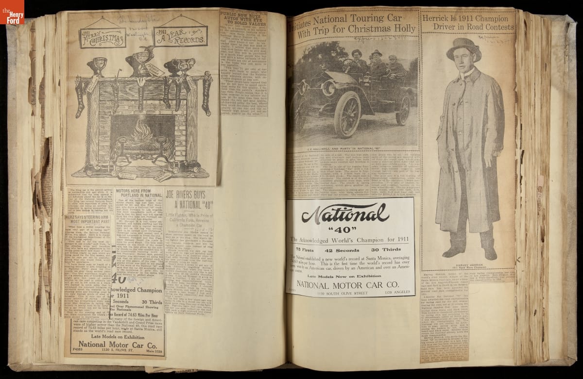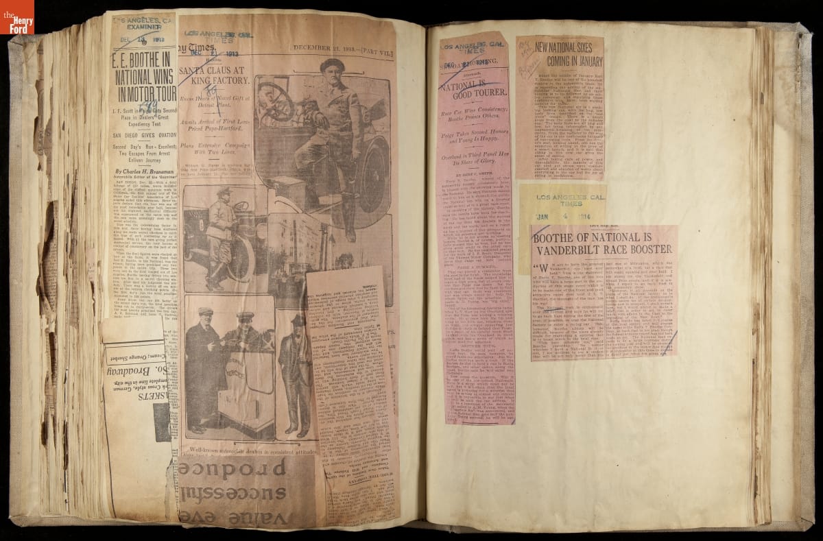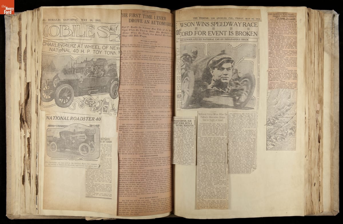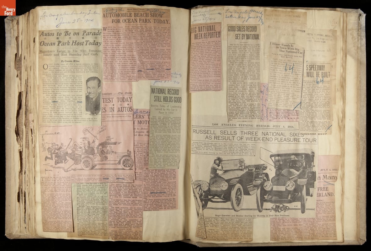 National was formed in Indianapolis in 1900 as a maker of electric cars, but it transitioned to gasoline six years later. The company had an active racing program. This scrapbook, assembled by a distributor in Los Angeles, tracked National's motorsport successes. The company's annual production peaked at something over 1,800 cars in 1915. National ended operations in 1924.