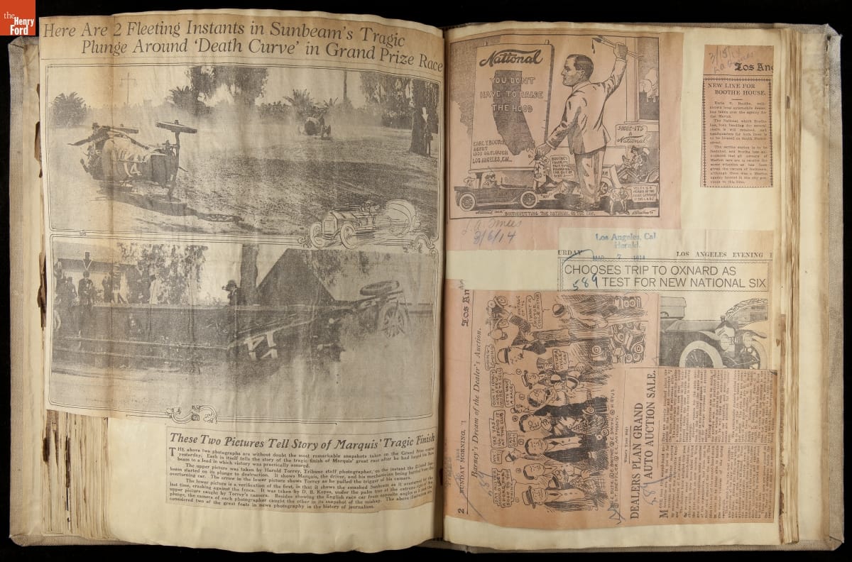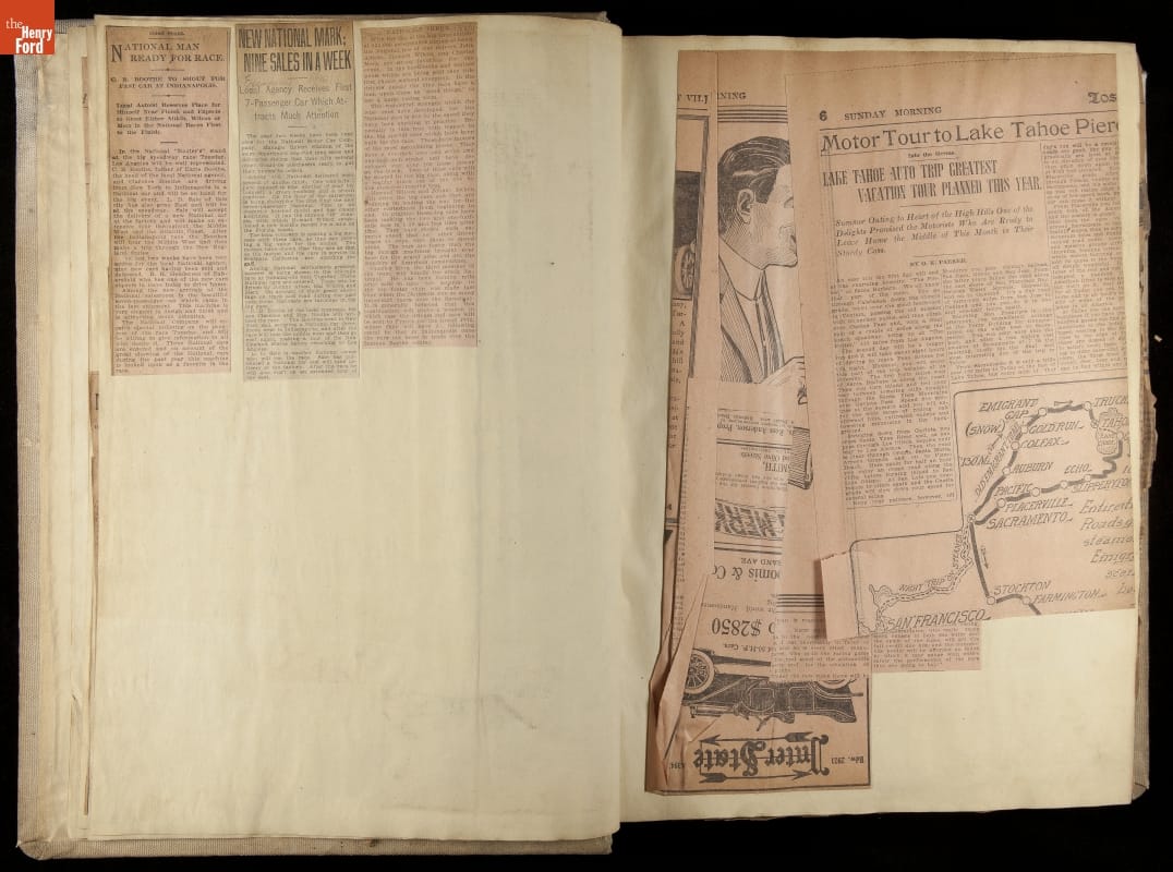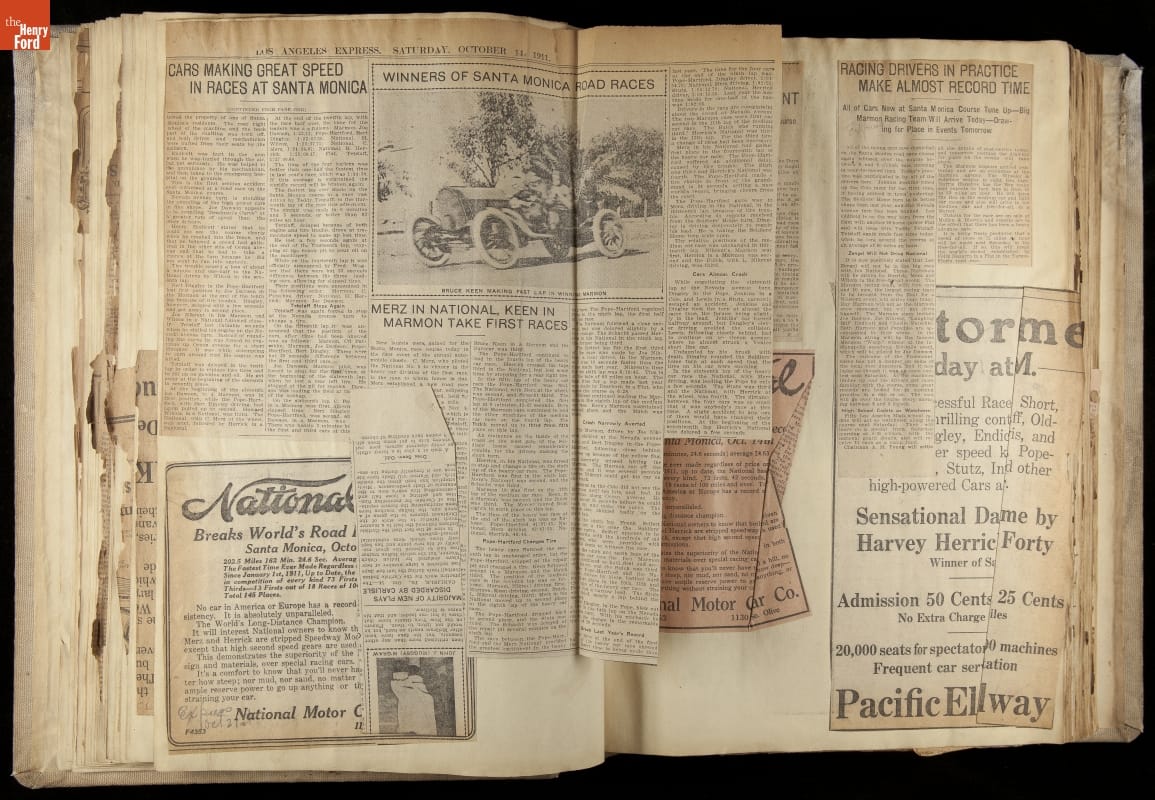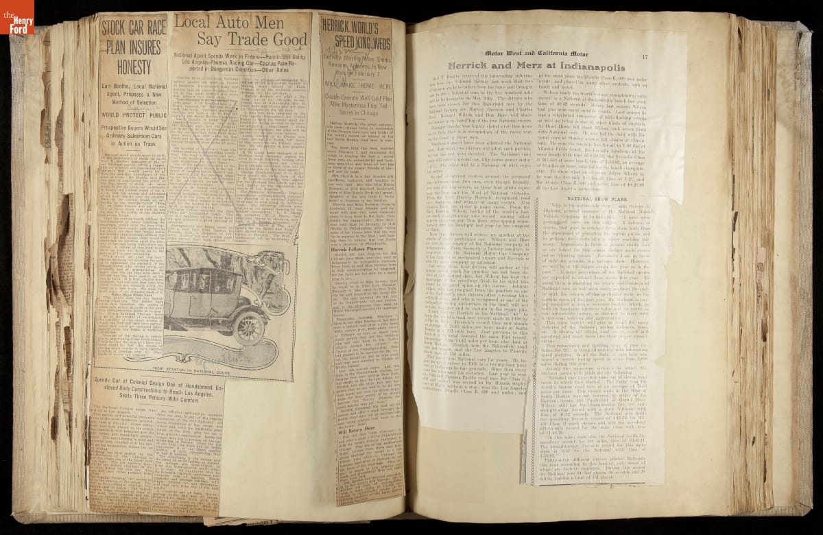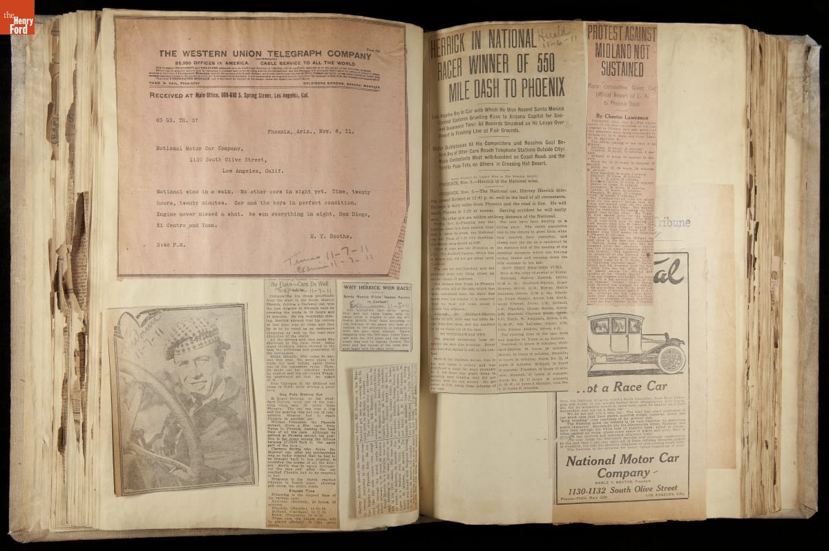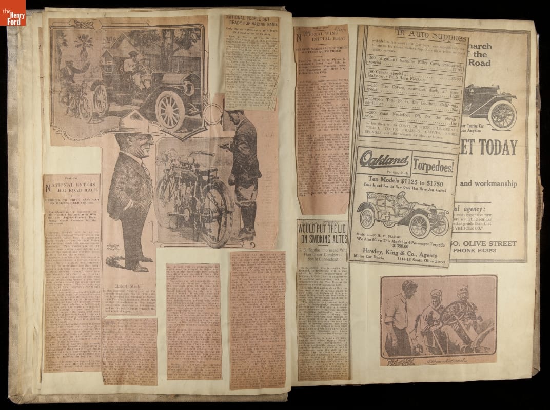 National was formed in Indianapolis in 1900 as a maker of electric cars, but it transitioned to gasoline six years later. The company had an active racing program. This scrapbook, assembled by a distributor in Los Angeles, tracked National's motorsport successes. The company's annual production peaked at something over 1,800 cars in 1915. National ended operations in 1924.