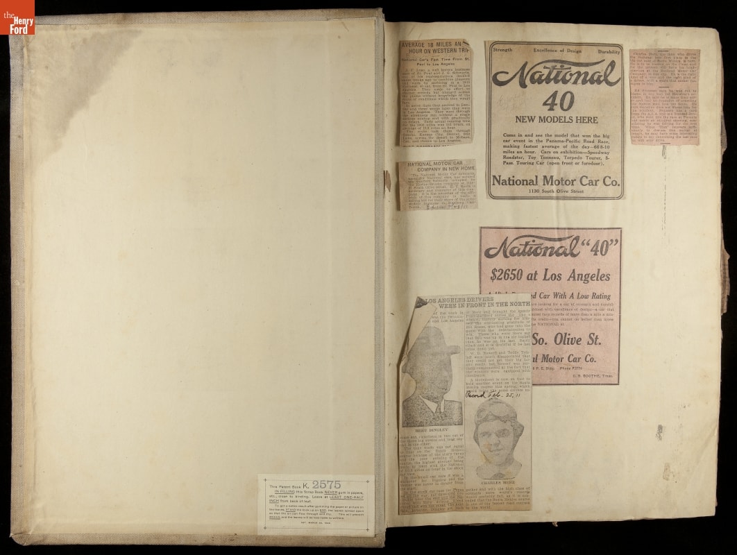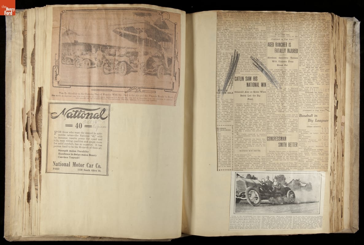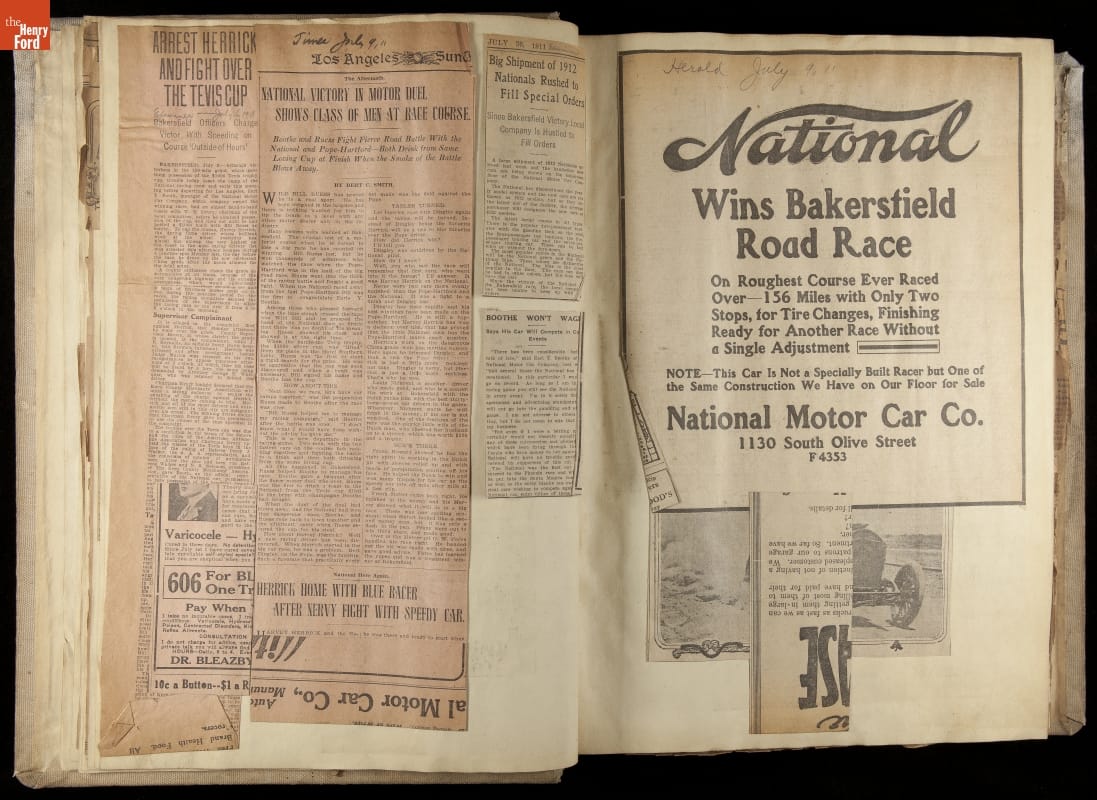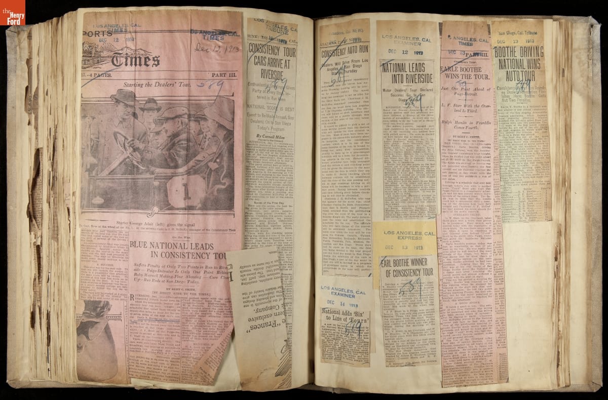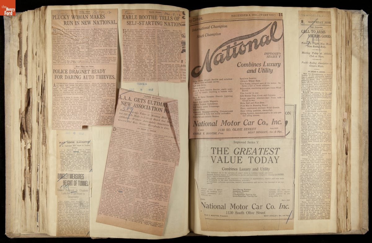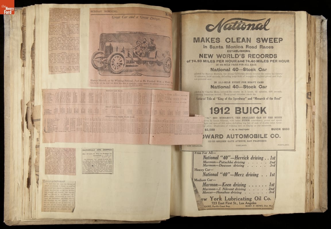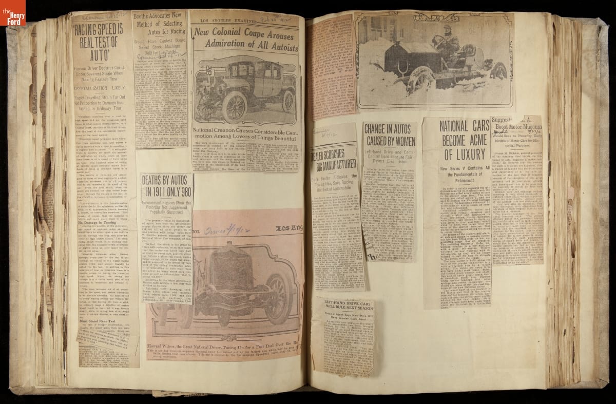 National was formed in Indianapolis in 1900 as a maker of electric cars, but it transitioned to gasoline six years later. The company had an active racing program. This scrapbook, assembled by a distributor in Los Angeles, tracked National's motorsport successes. The company's annual production peaked at something over 1,800 cars in 1915. National ended operations in 1924.
