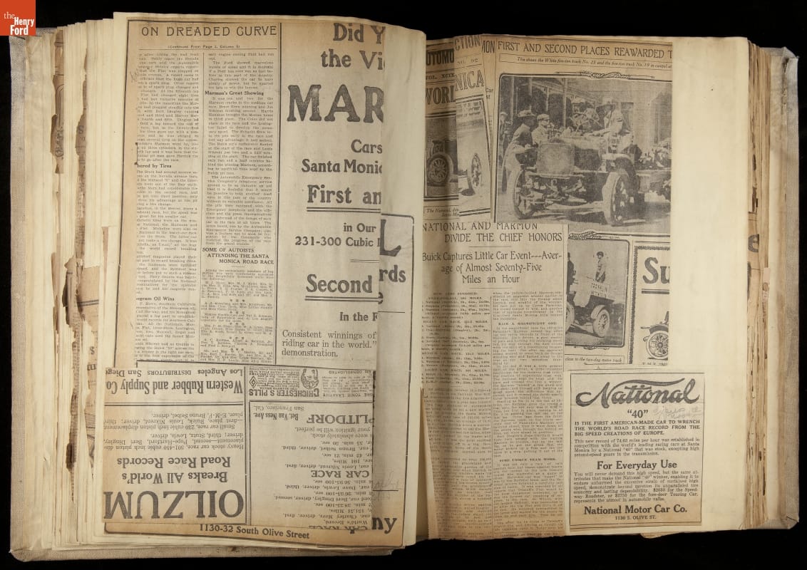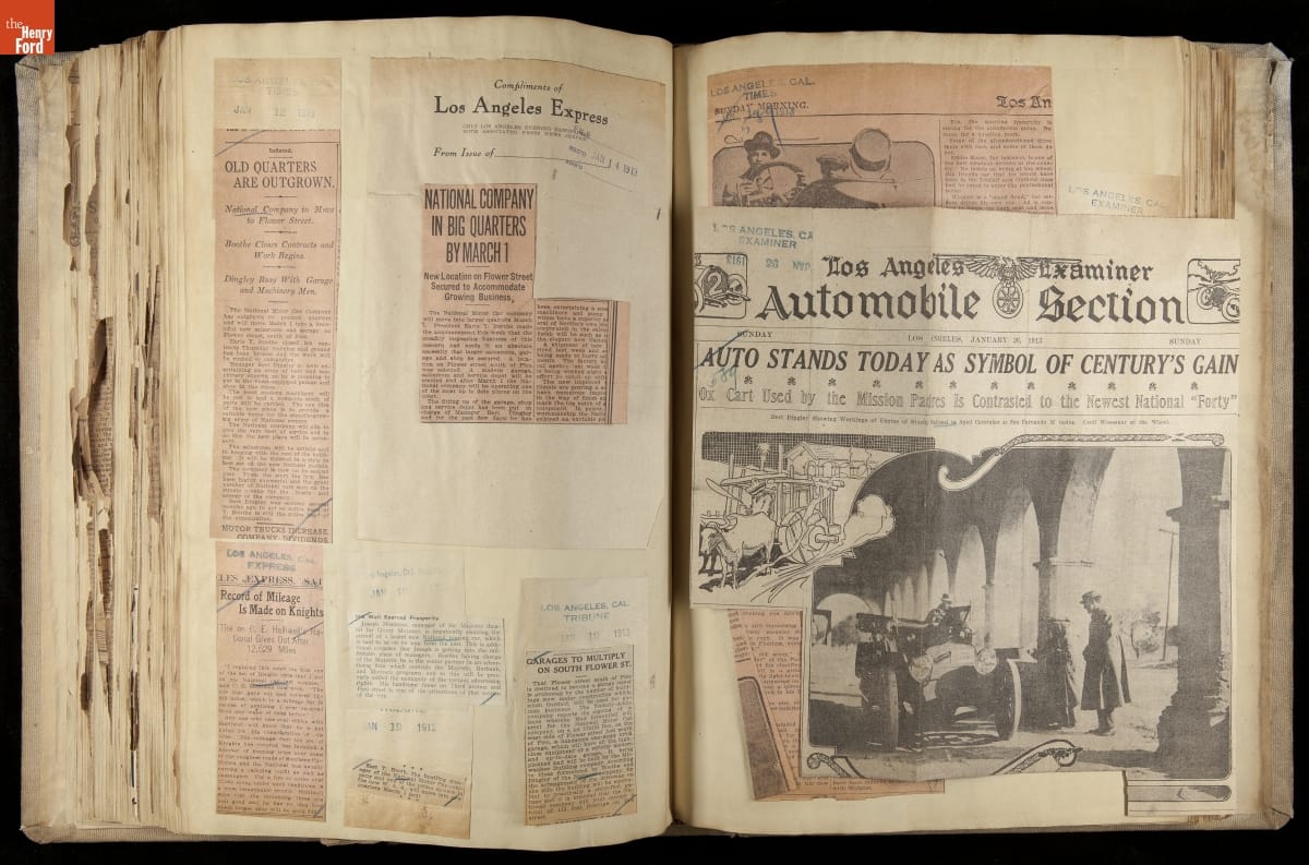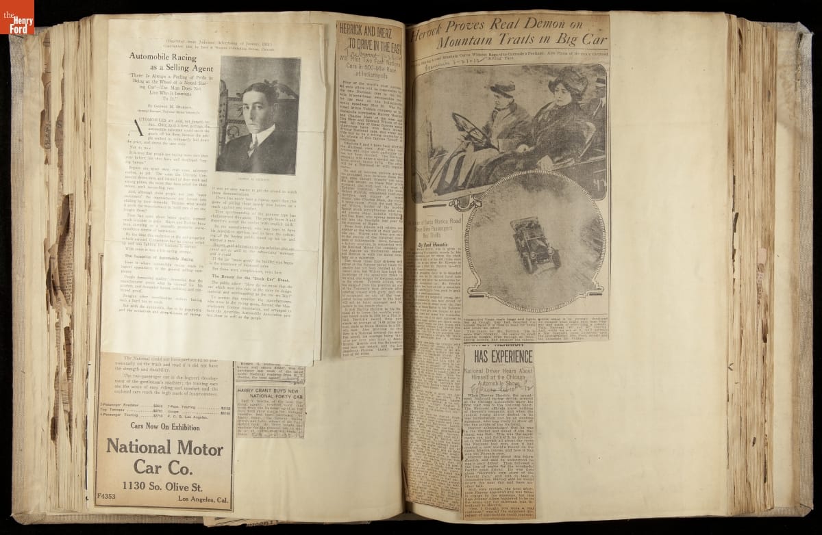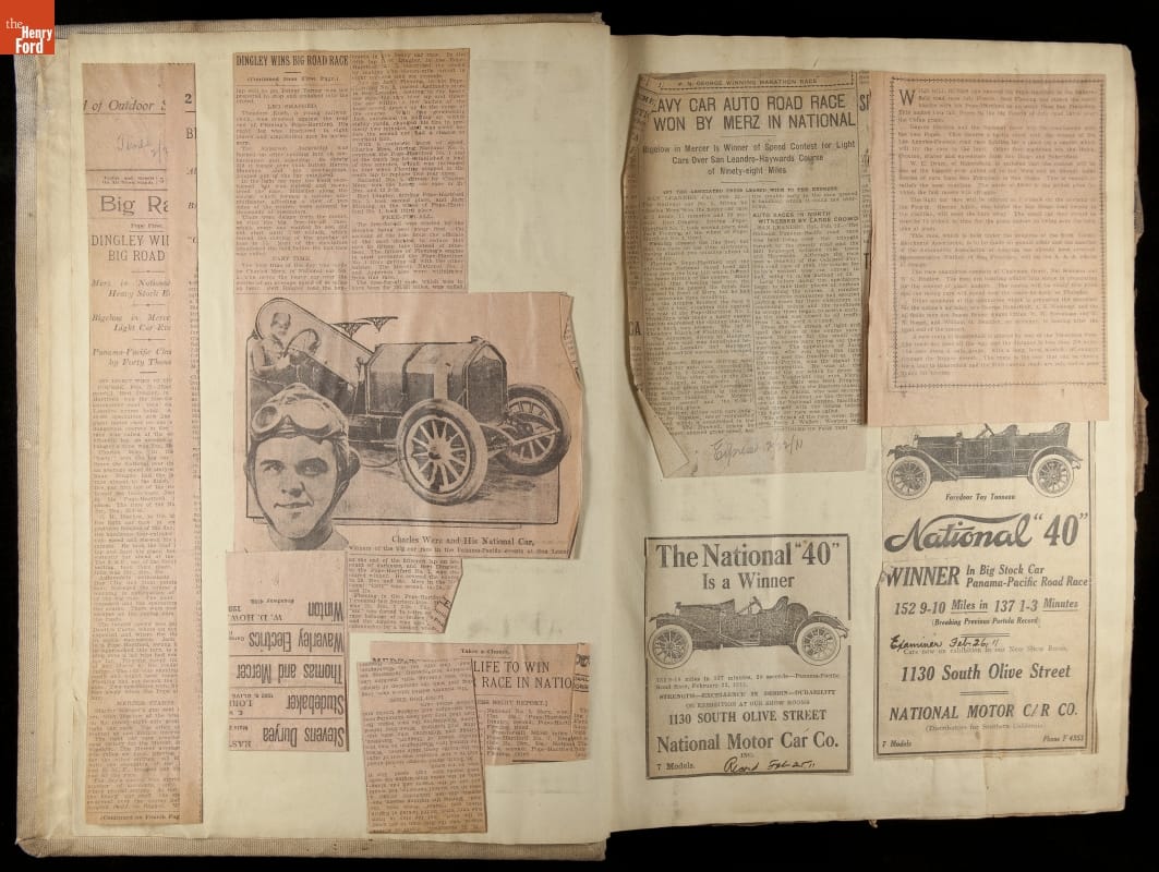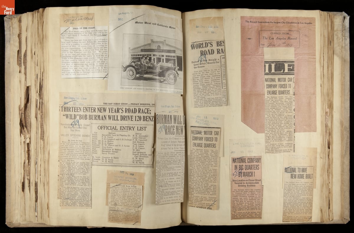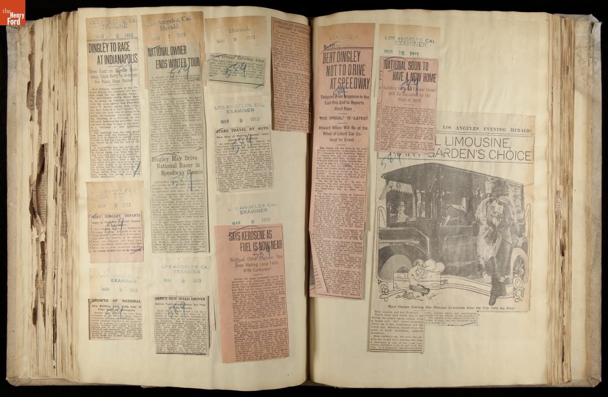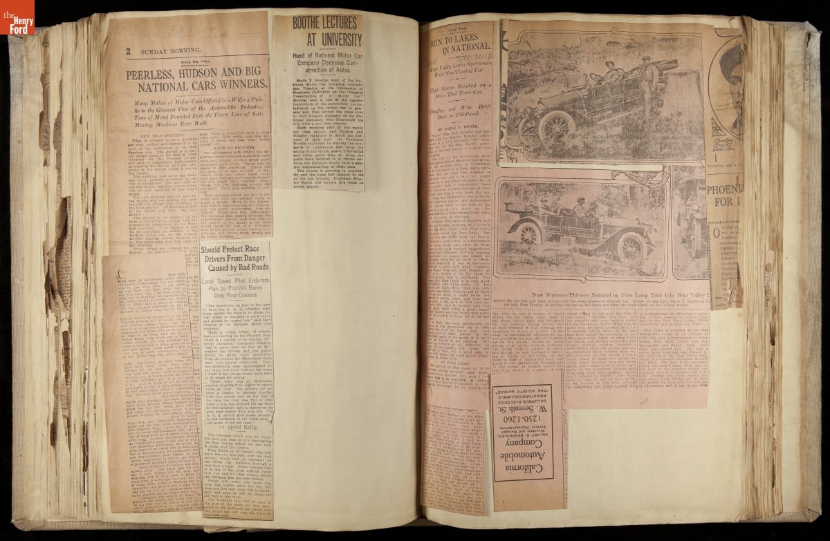 National was formed in Indianapolis in 1900 as a maker of electric cars, but it transitioned to gasoline six years later. The company had an active racing program. This scrapbook, assembled by a distributor in Los Angeles, tracked National's motorsport successes. The company's annual production peaked at something over 1,800 cars in 1915. National ended operations in 1924.