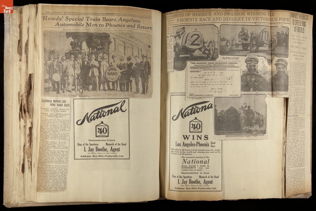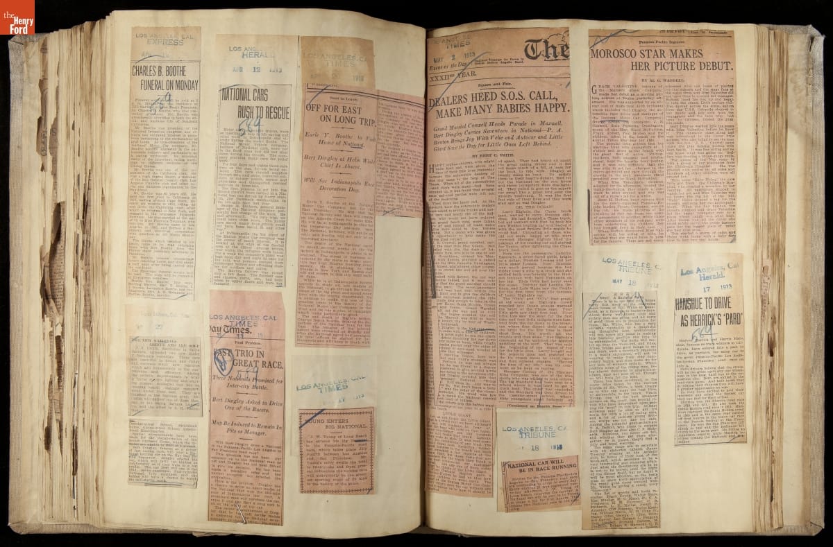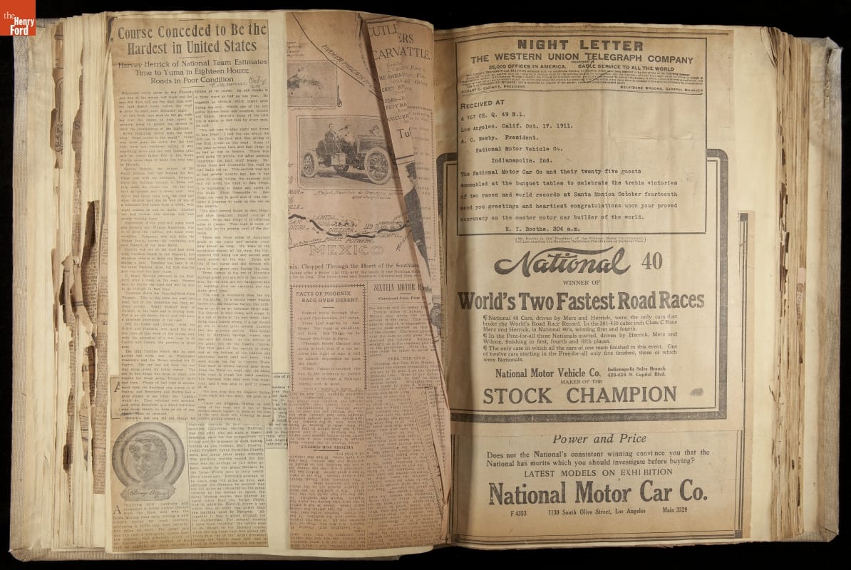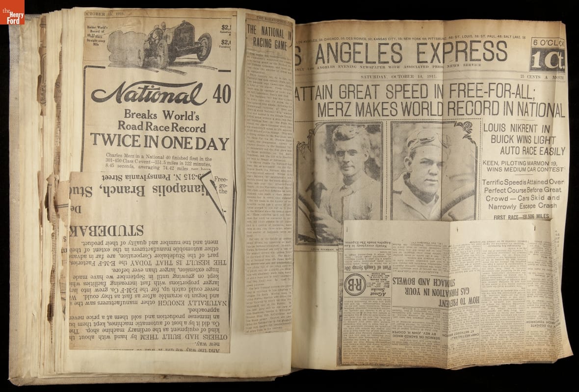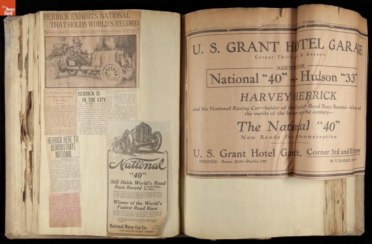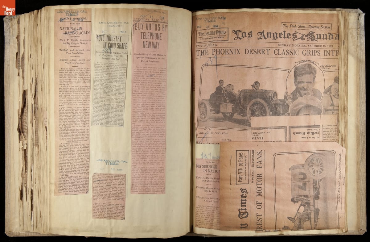 National was formed in Indianapolis in 1900 as a maker of electric cars, but it transitioned to gasoline six years later. The company had an active racing program. This scrapbook, assembled by a distributor in Los Angeles, tracked National's motorsport successes. The company's annual production peaked at something over 1,800 cars in 1915. National ended operations in 1924.