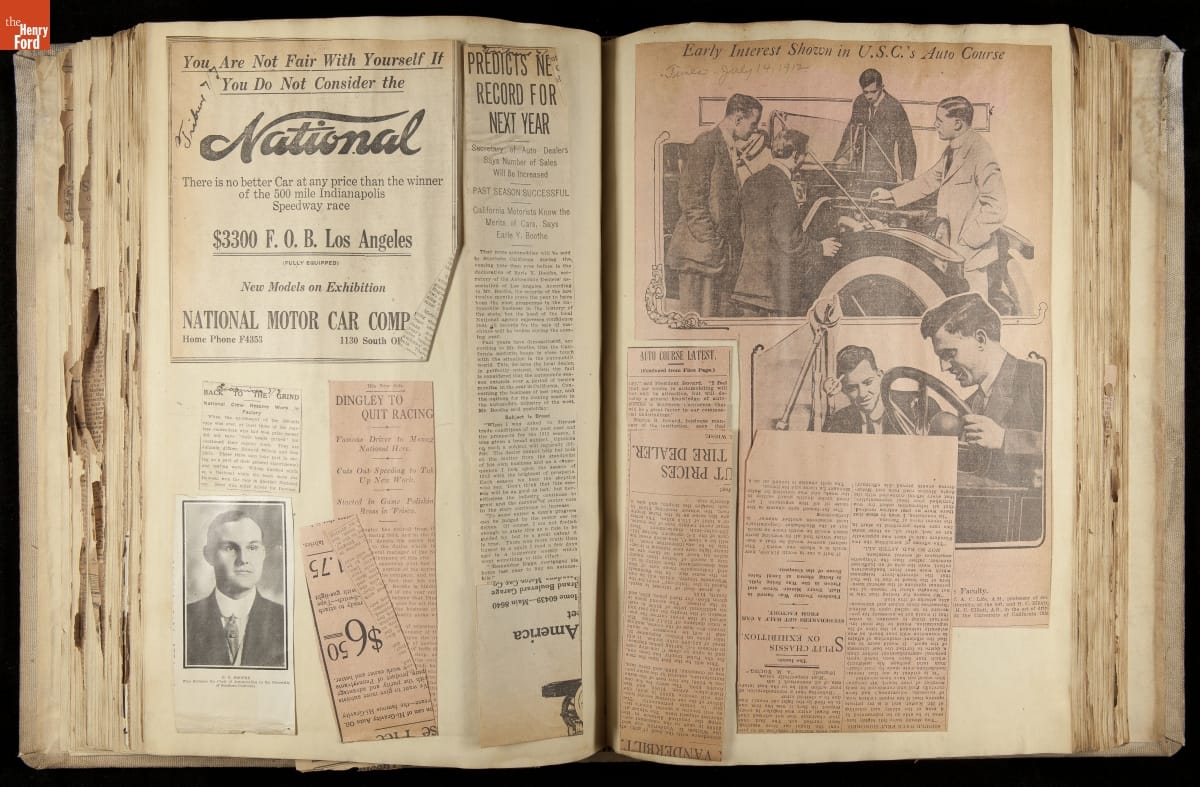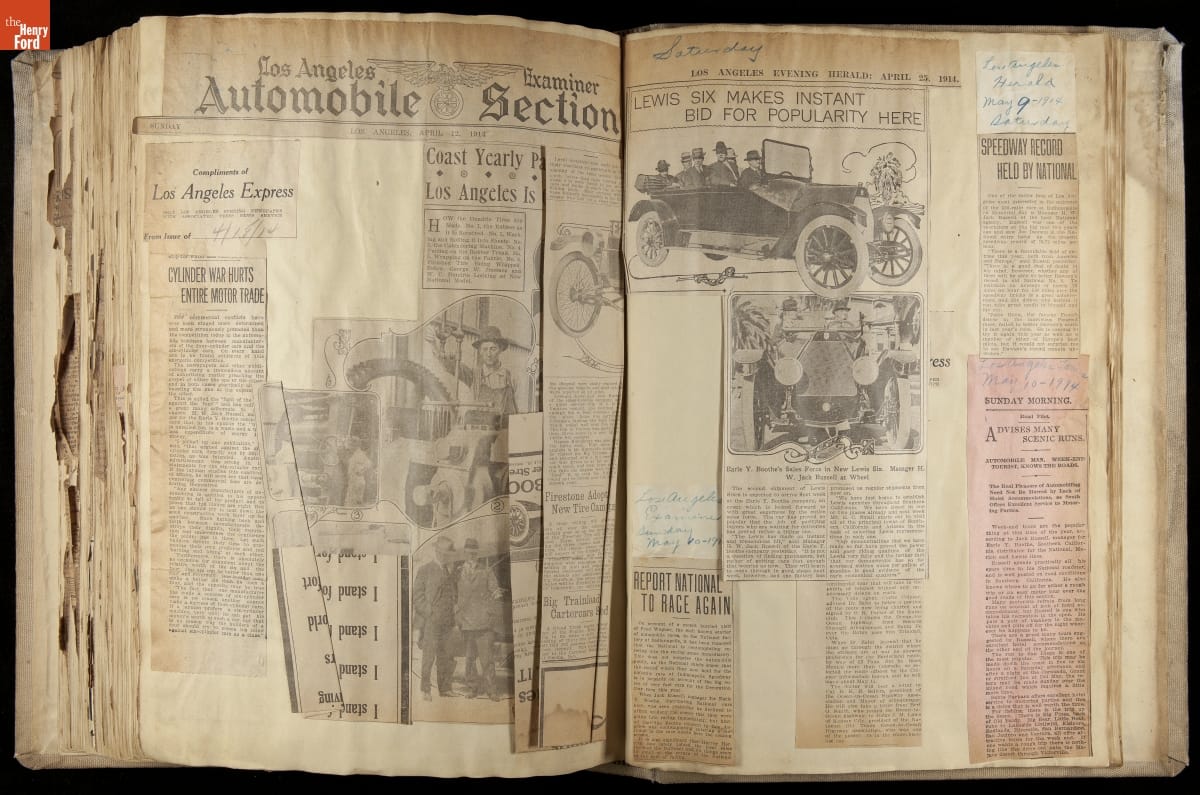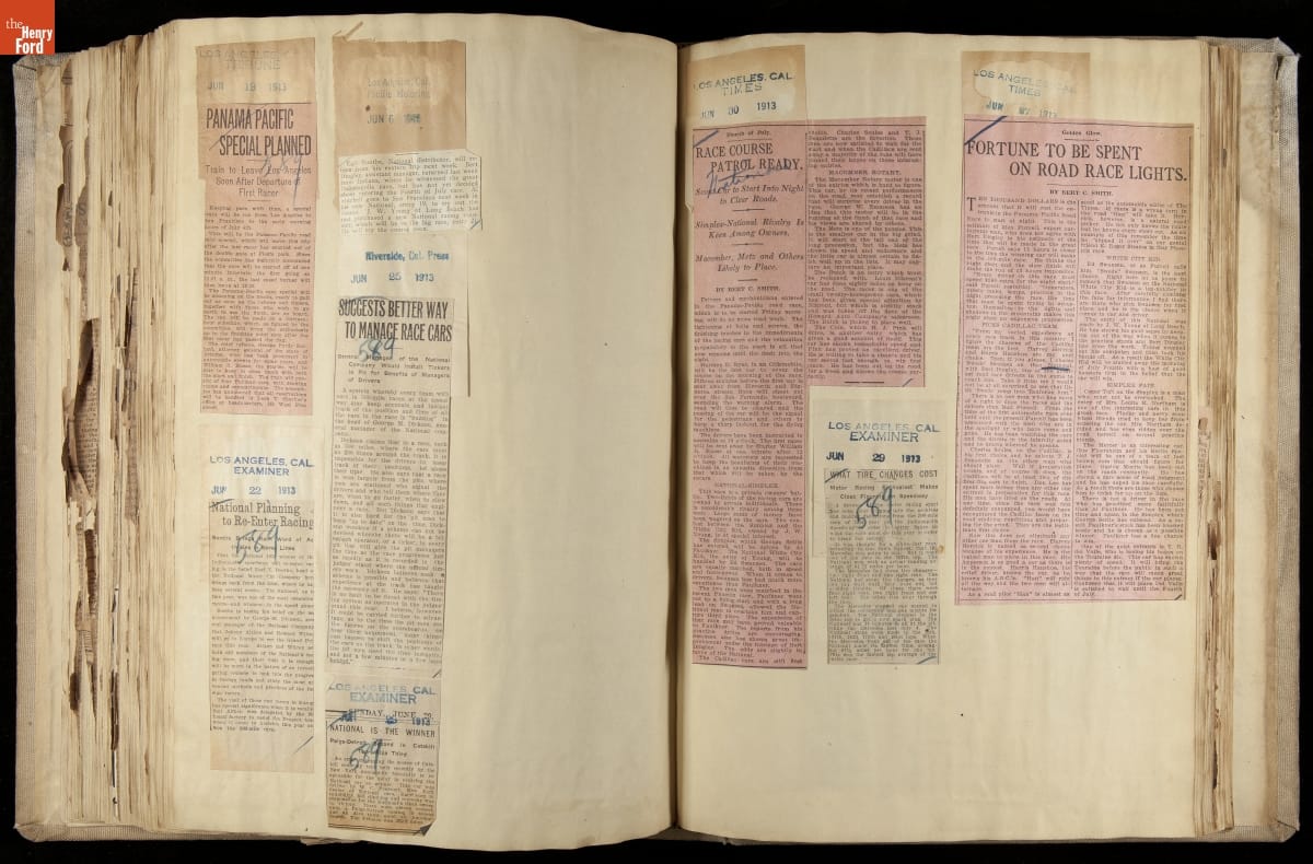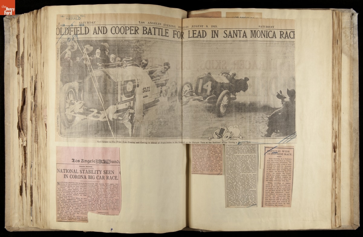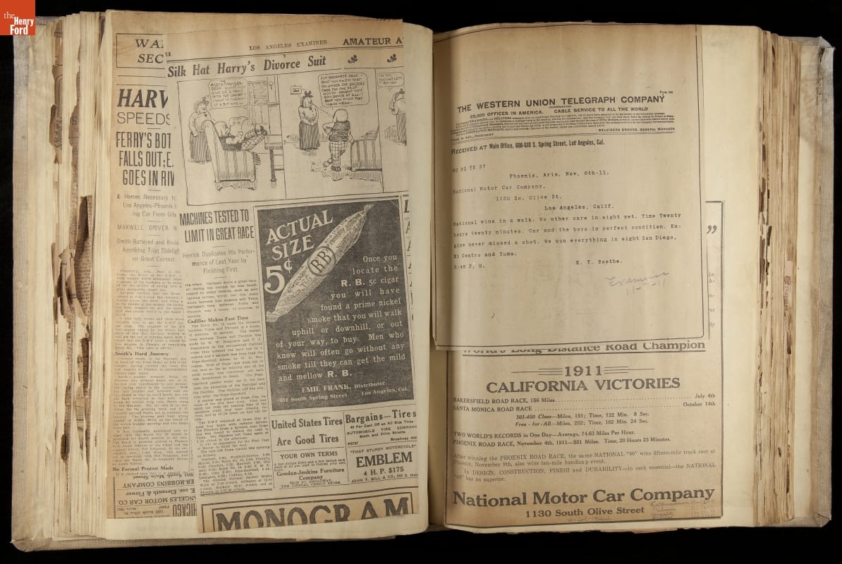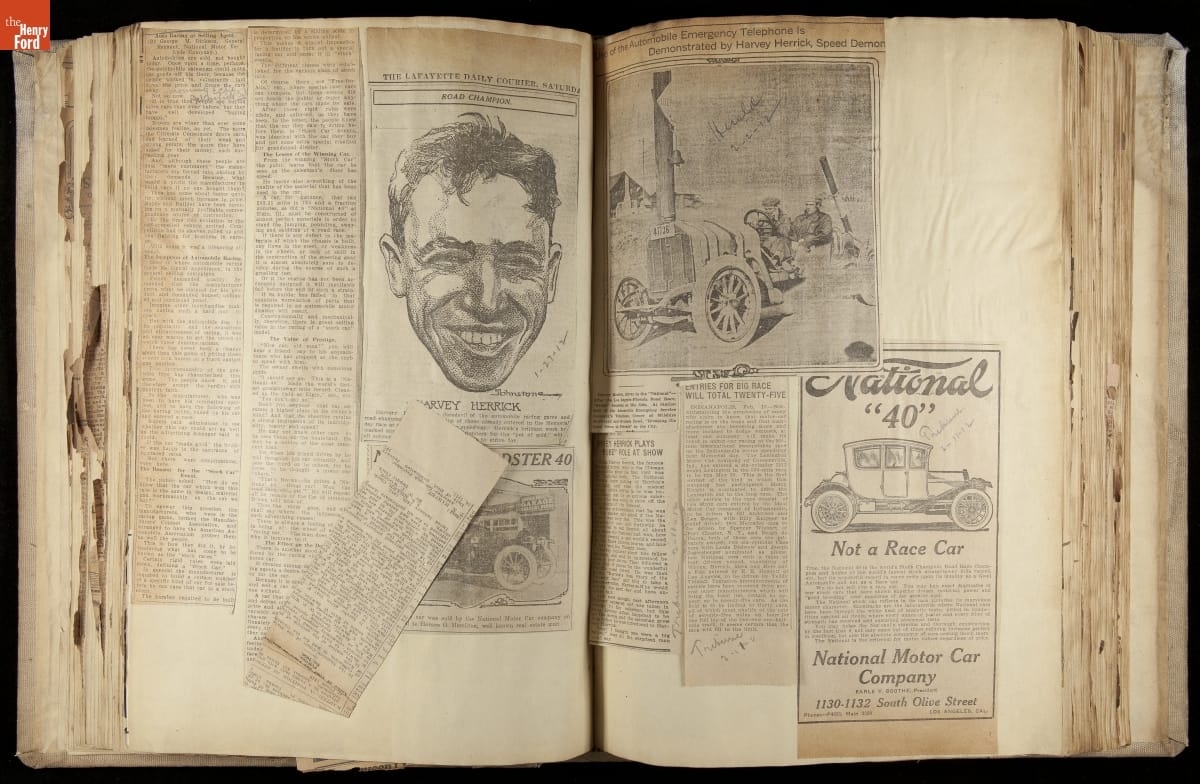 National was formed in Indianapolis in 1900 as a maker of electric cars, but it transitioned to gasoline six years later. The company had an active racing program. This scrapbook, assembled by a distributor in Los Angeles, tracked National's motorsport successes. The company's annual production peaked at something over 1,800 cars in 1915. National ended operations in 1924.