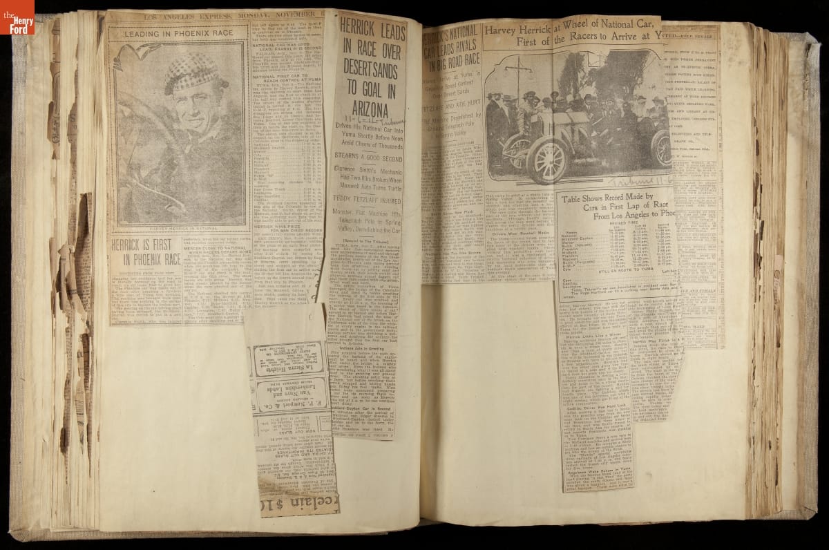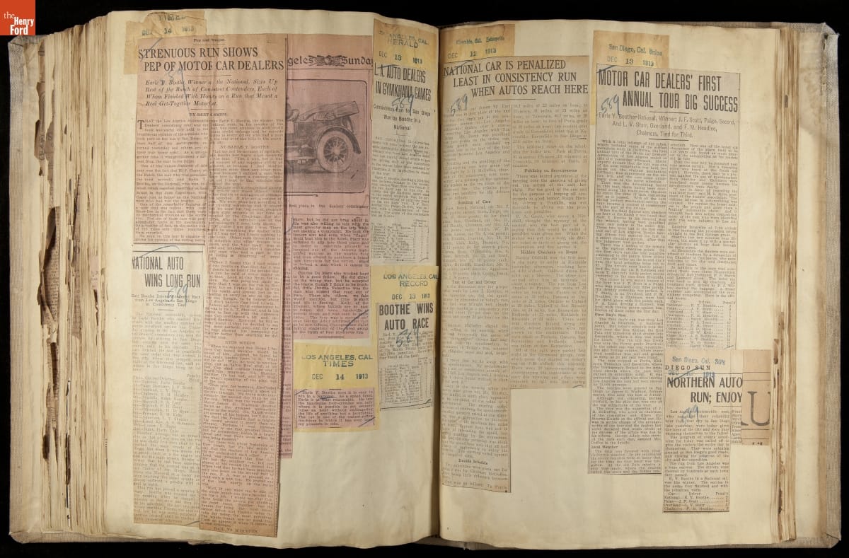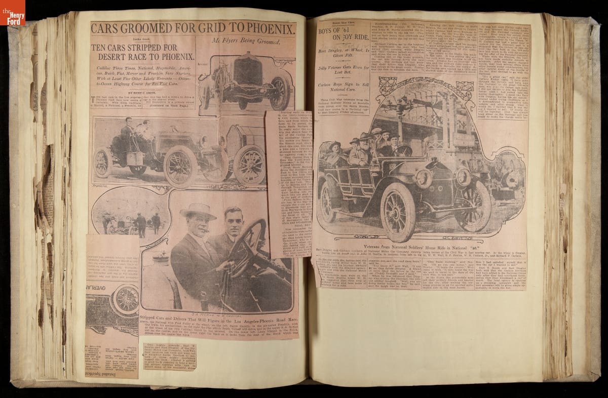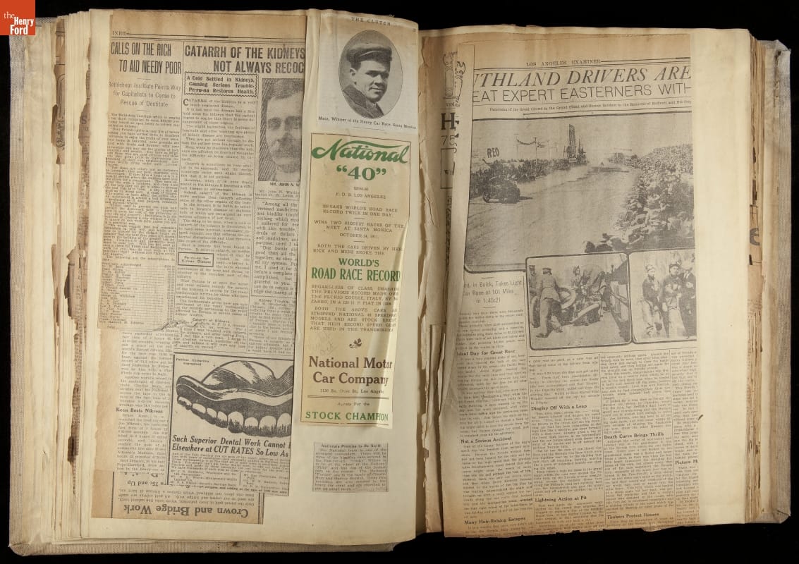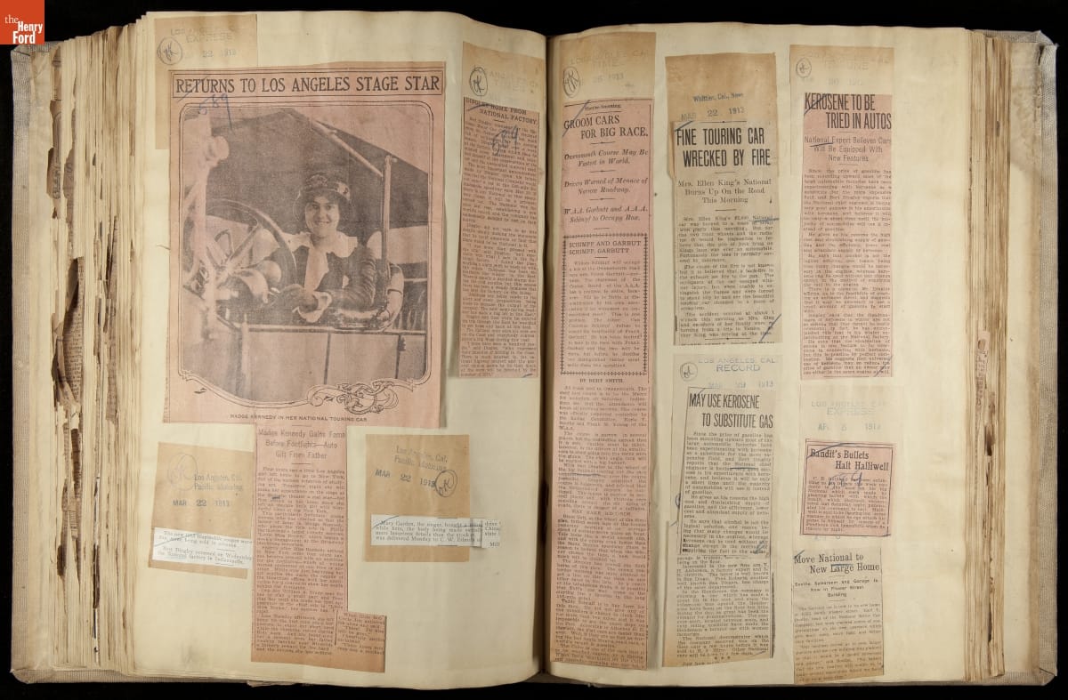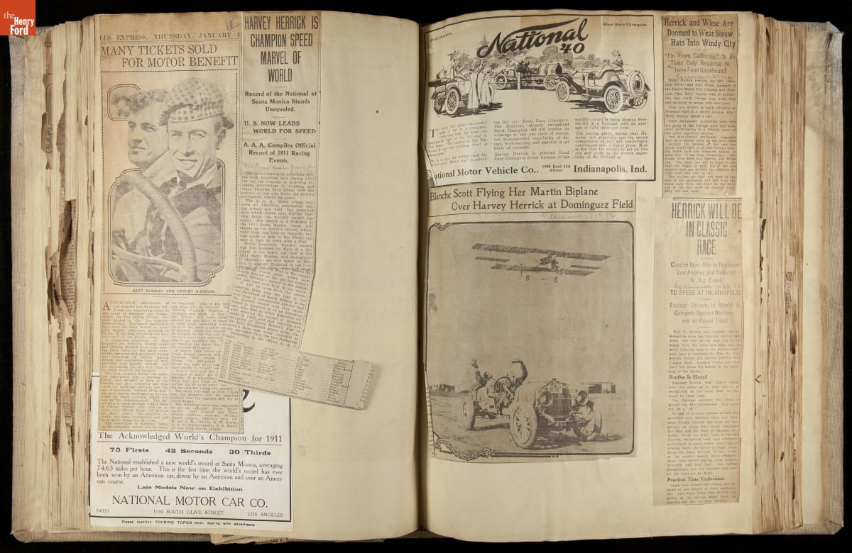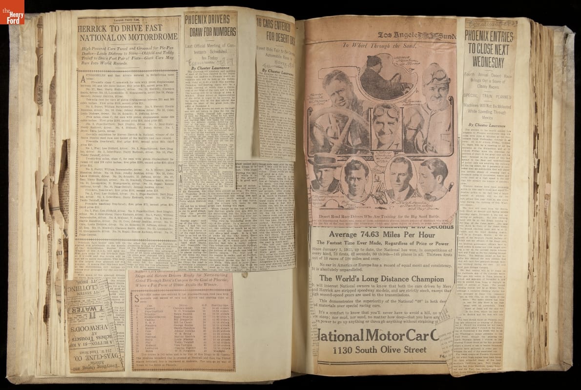 National was formed in Indianapolis in 1900 as a maker of electric cars, but it transitioned to gasoline six years later. The company had an active racing program. This scrapbook, assembled by a distributor in Los Angeles, tracked National's motorsport successes. The company's annual production peaked at something over 1,800 cars in 1915. National ended operations in 1924.