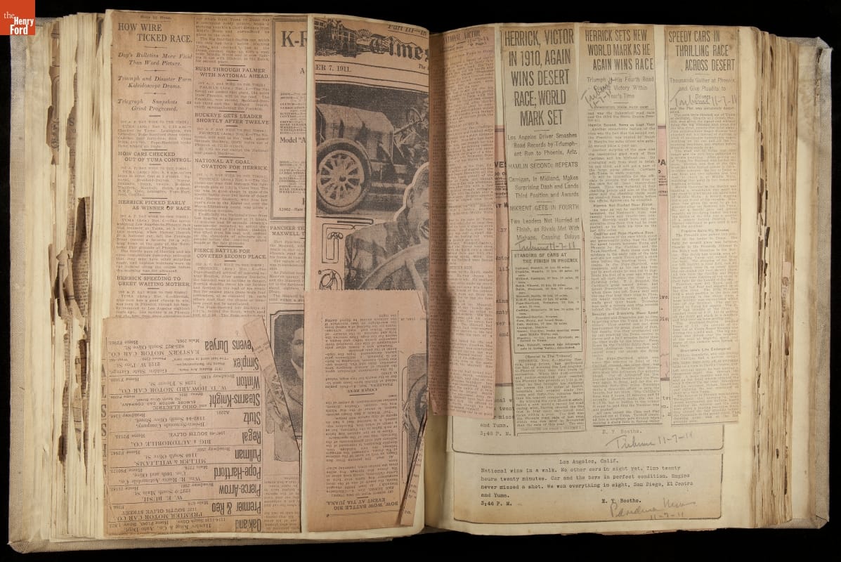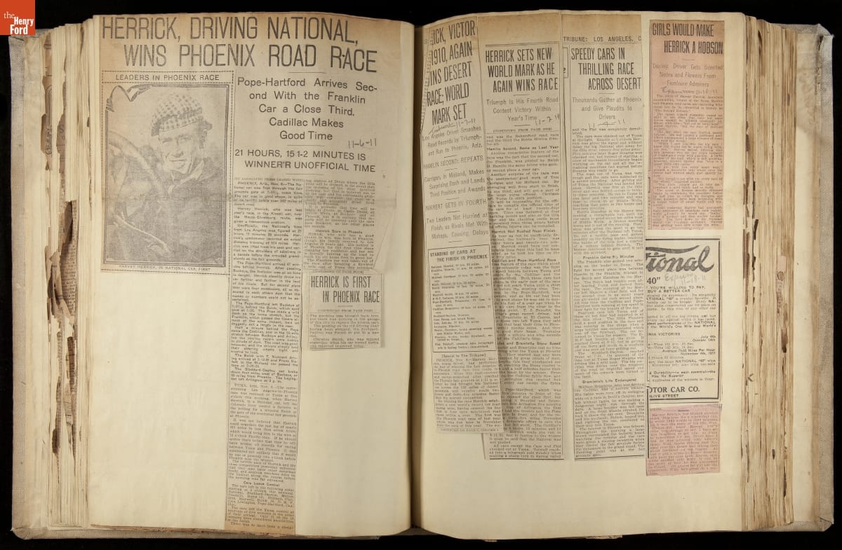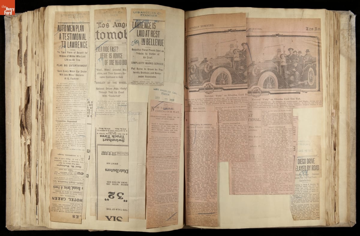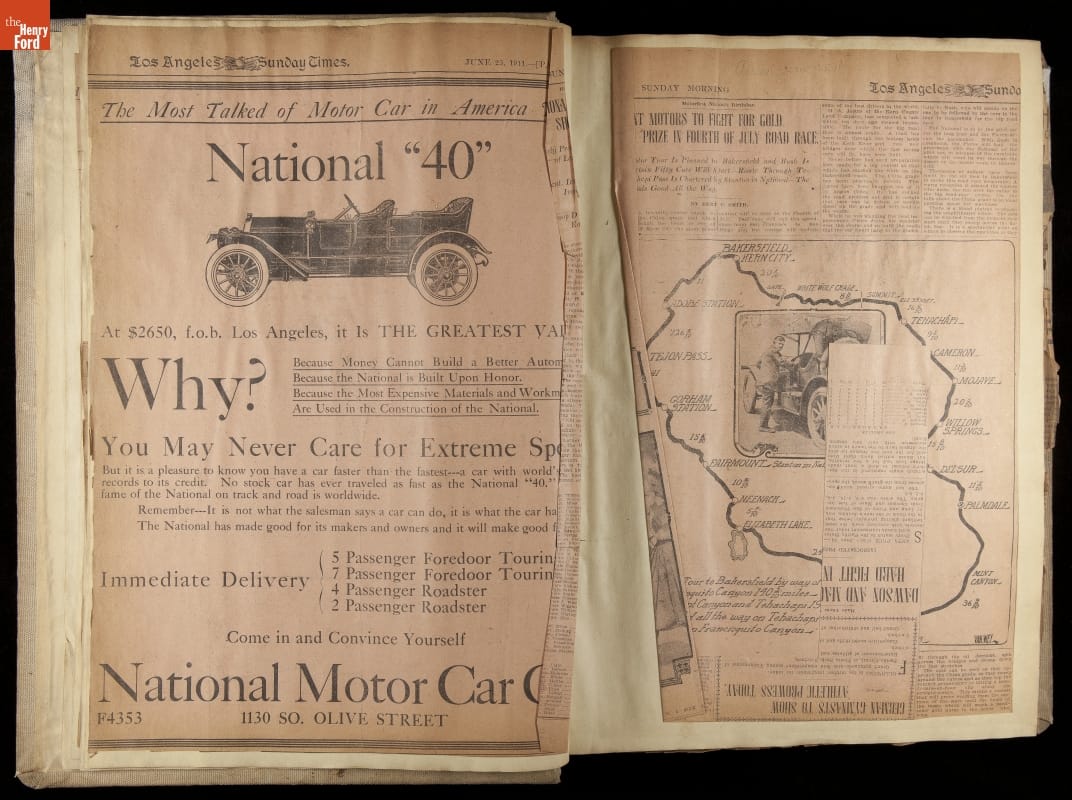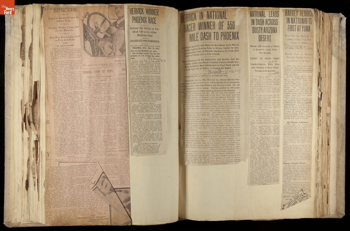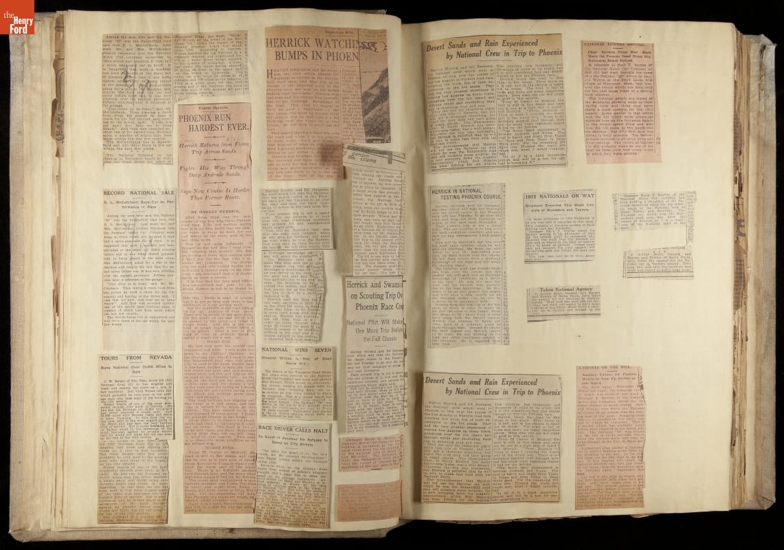 National was formed in Indianapolis in 1900 as a maker of electric cars, but it transitioned to gasoline six years later. The company had an active racing program. This scrapbook, assembled by a distributor in Los Angeles, tracked National's motorsport successes. The company's annual production peaked at something over 1,800 cars in 1915. National ended operations in 1924.