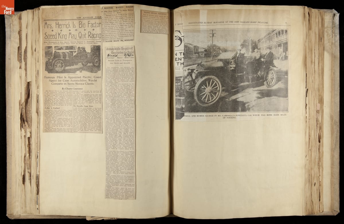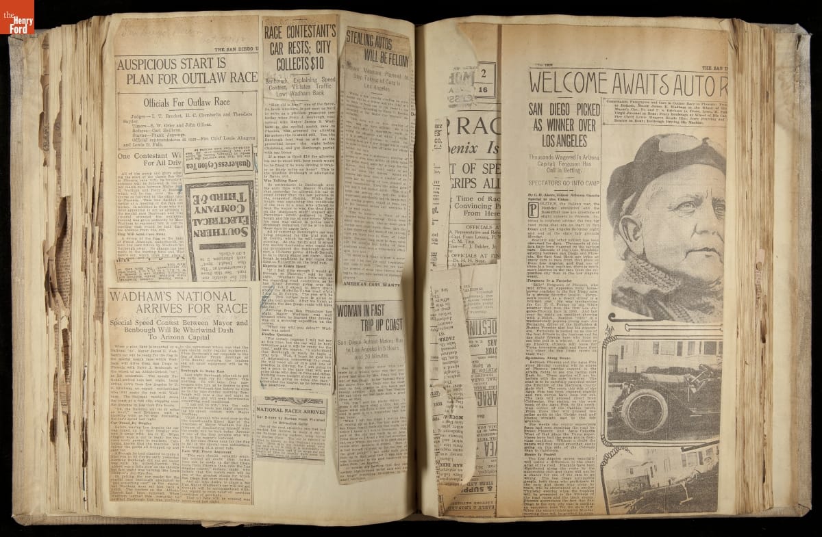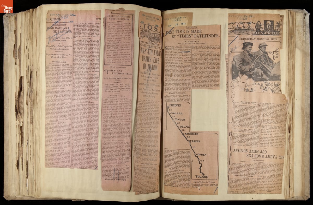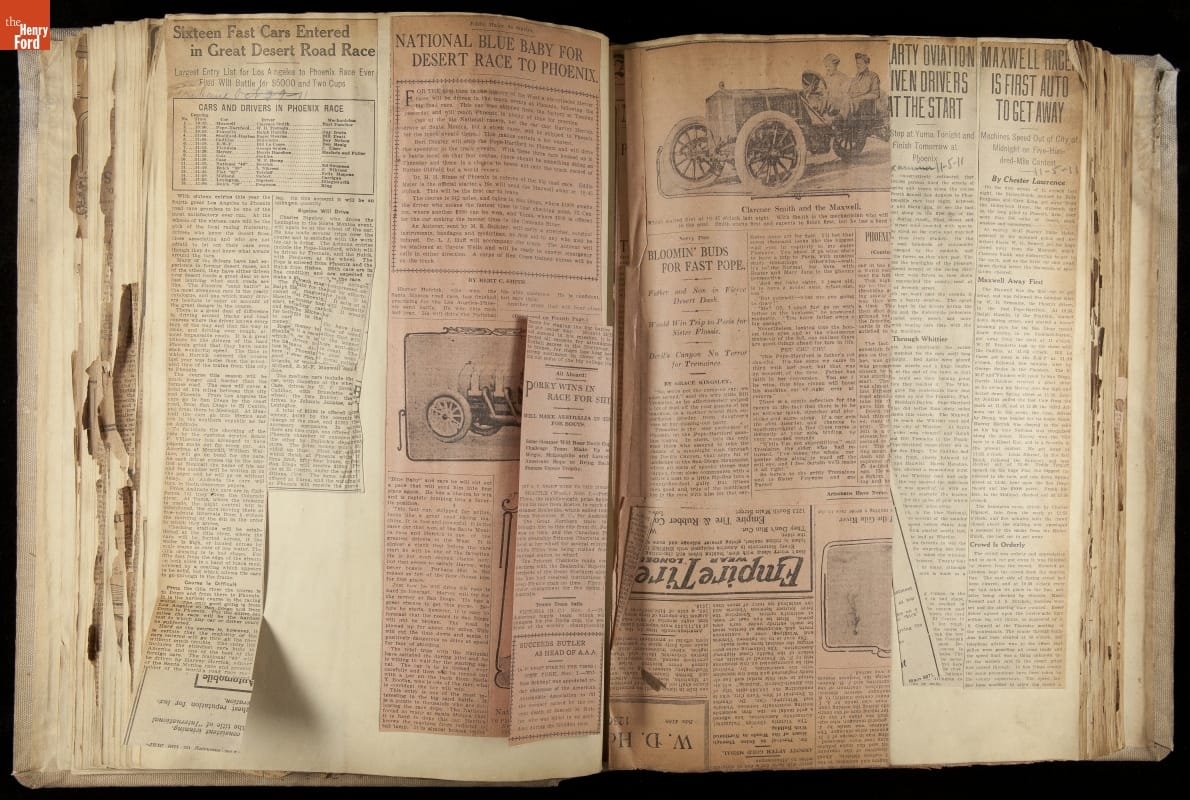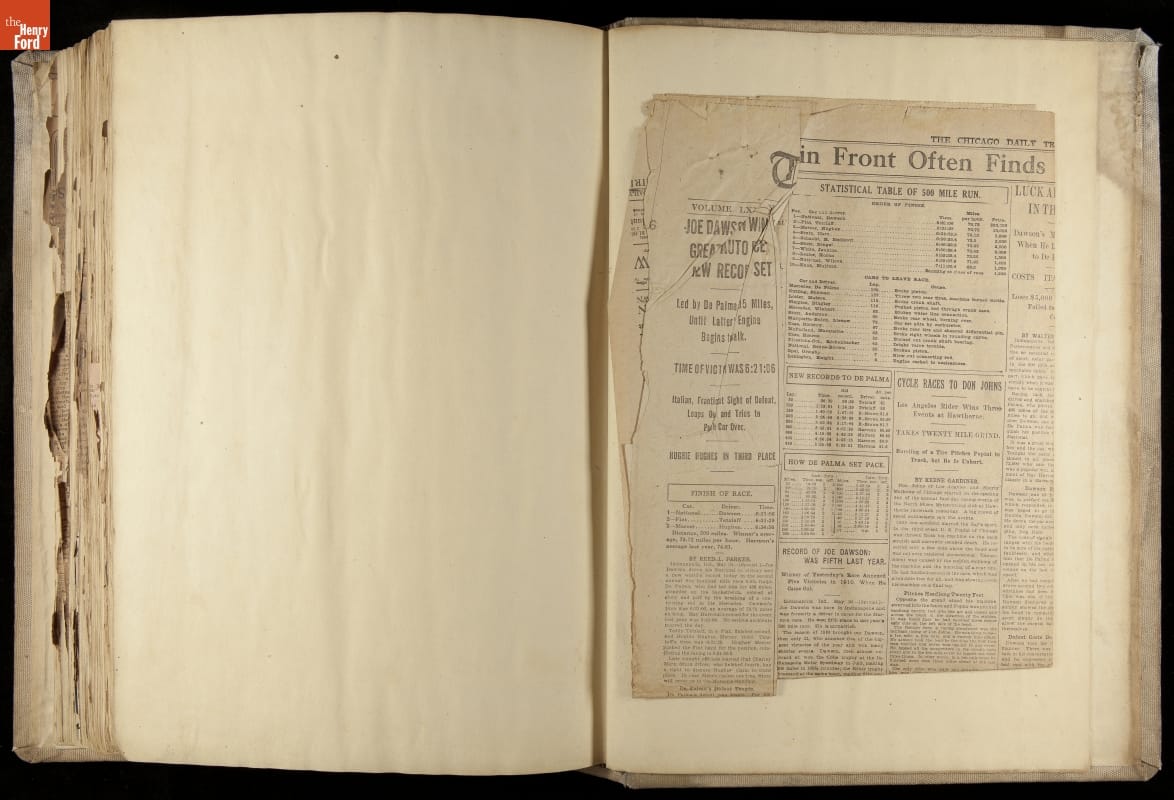 THF230619 / Scrapbook, National Motor Car Company Auto Racing, Race Cars and Drivers, 1911-1914 / pages 52-53, partially unfolded