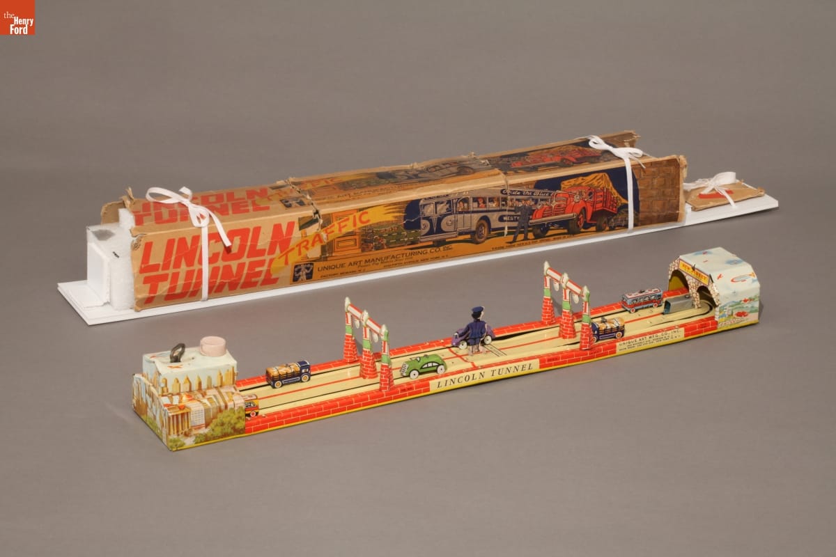 This lithographed, pressed metal toy by Unique Art Manufacturing Company, Inc., has vehicles traveling in and out of the Lincoln Tunnel. Cars enter either through rural New Jersey or urban New York. The Lincoln Tunnel opened in 1937 and runs under the Hudson River between New Jersey and Manhattan.