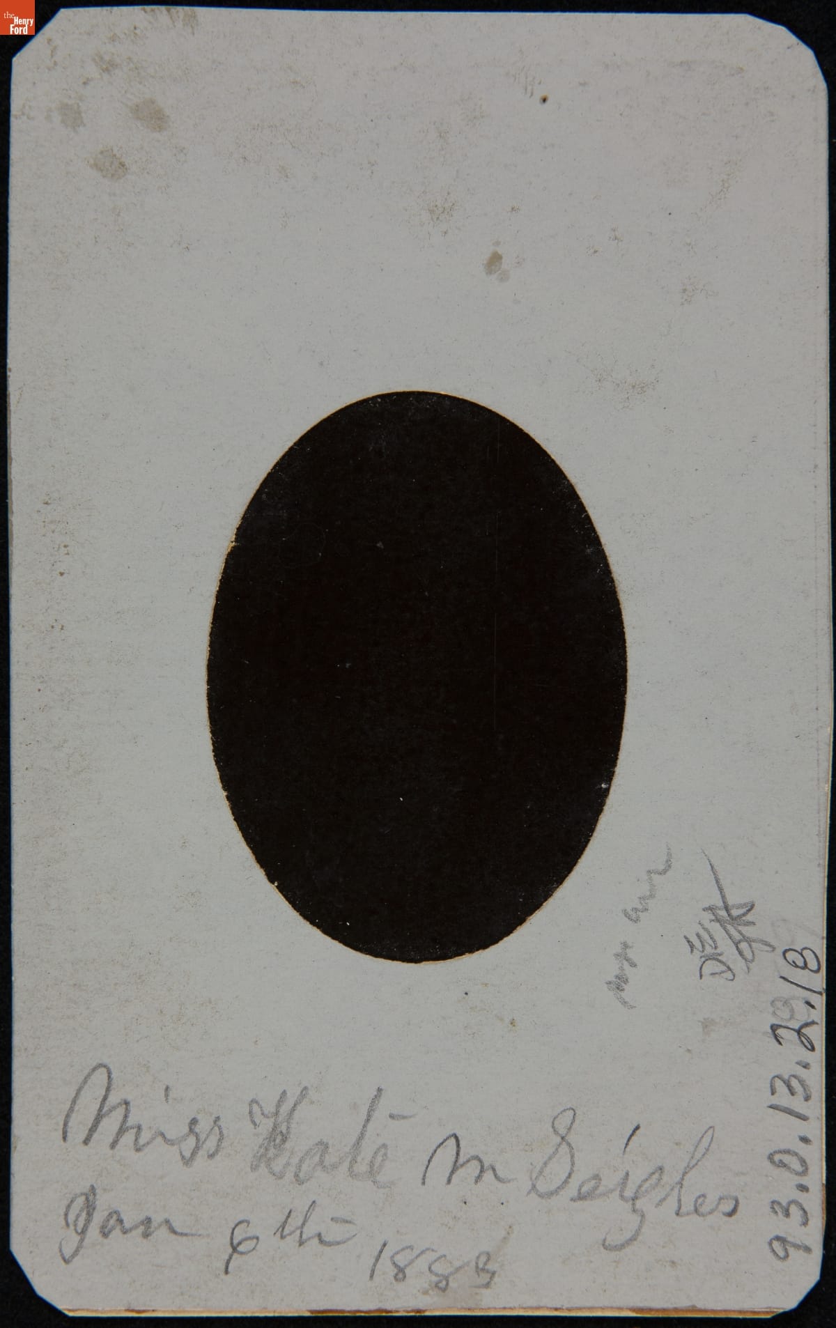 back of paper frame, in pencil: "Miss Kate M. Siegles / Jan 6th 1883"