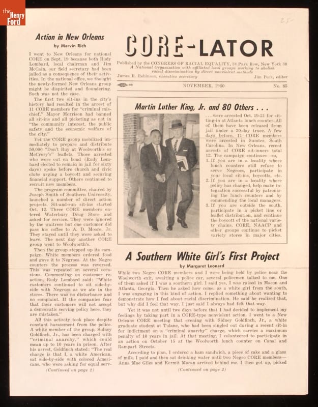 The Congress of Racial Equality (CORE), founded in 1942, pioneered nonviolent civil rights activism. Members organized and participated in many sit-ins, freedom rides and other nonviolent actions during the Civil Rights era. This newsletter from 1960 informs readers about the arrests throughout the South of CORE members and Martin Luther King, Jr. for lunch counter sit-ins.