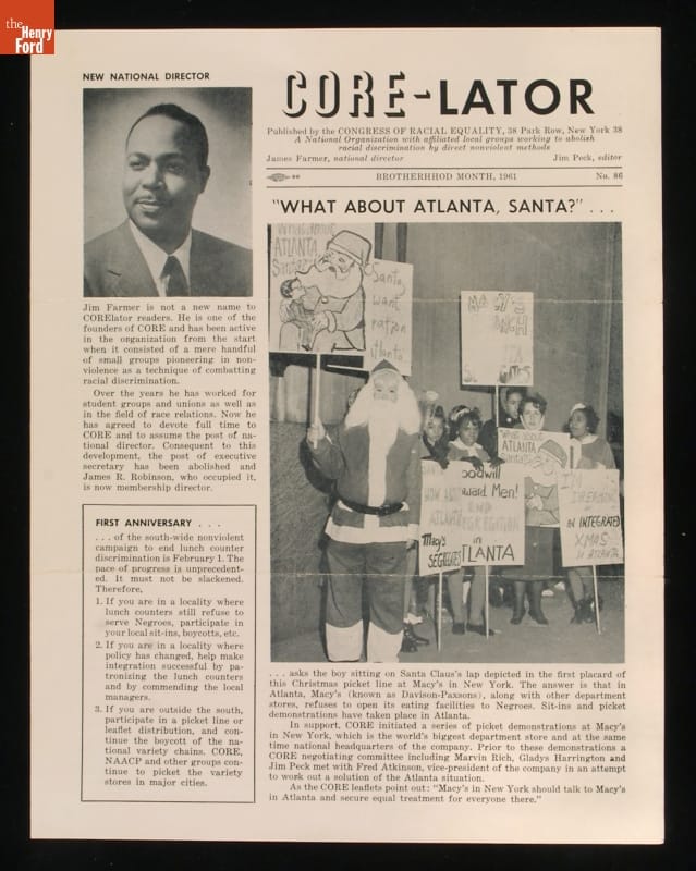 The Congress of Racial Equality (CORE), founded in 1942, pioneered nonviolent civil rights activism. Members organized and participated in many sit-ins, freedom rides and other nonviolent actions during the Civil Rights era. This newsletter from 1961 pictures Jim Farmer, one of the founders of CORE, and informs readers about the continuing struggle to desegregate lunch counters throughout the country.