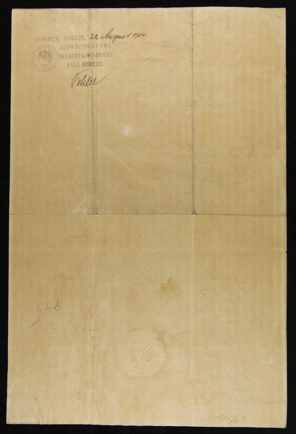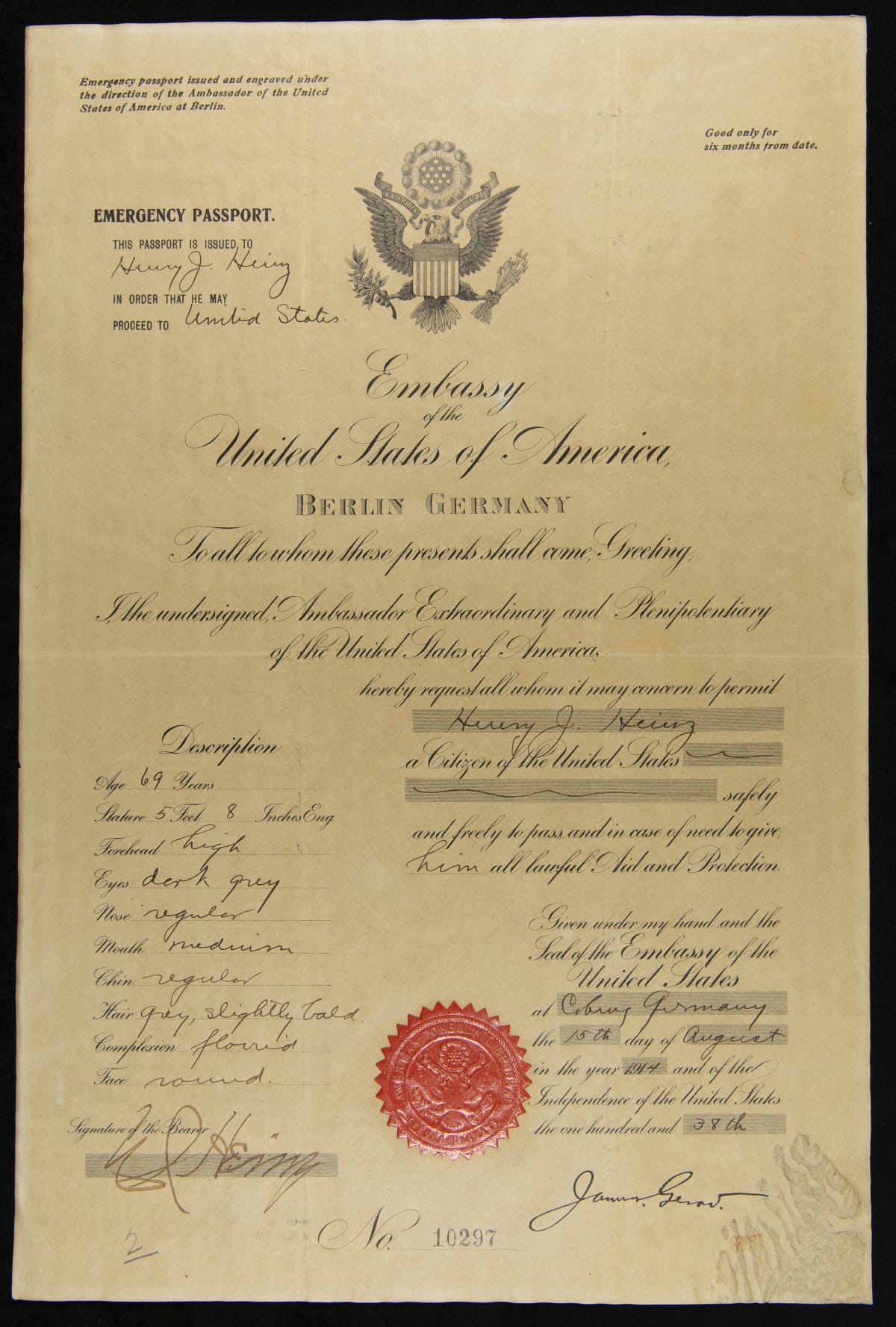 Emergency Passport to Berlin, Germany Issued to H. J. Heinz by the United States Embassy, August 15th, 1914