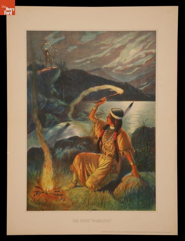 This poster shows a romanticized view of Native American culture: two people separated by nature and distance, using smoke signals to communicate. Dense black smoke produced by burning damp leaves was confined under a wet blanket--then allowed to escape in bursts. In this way, smoke transformed into a beacon, visible for miles across the vast expanse of early America.