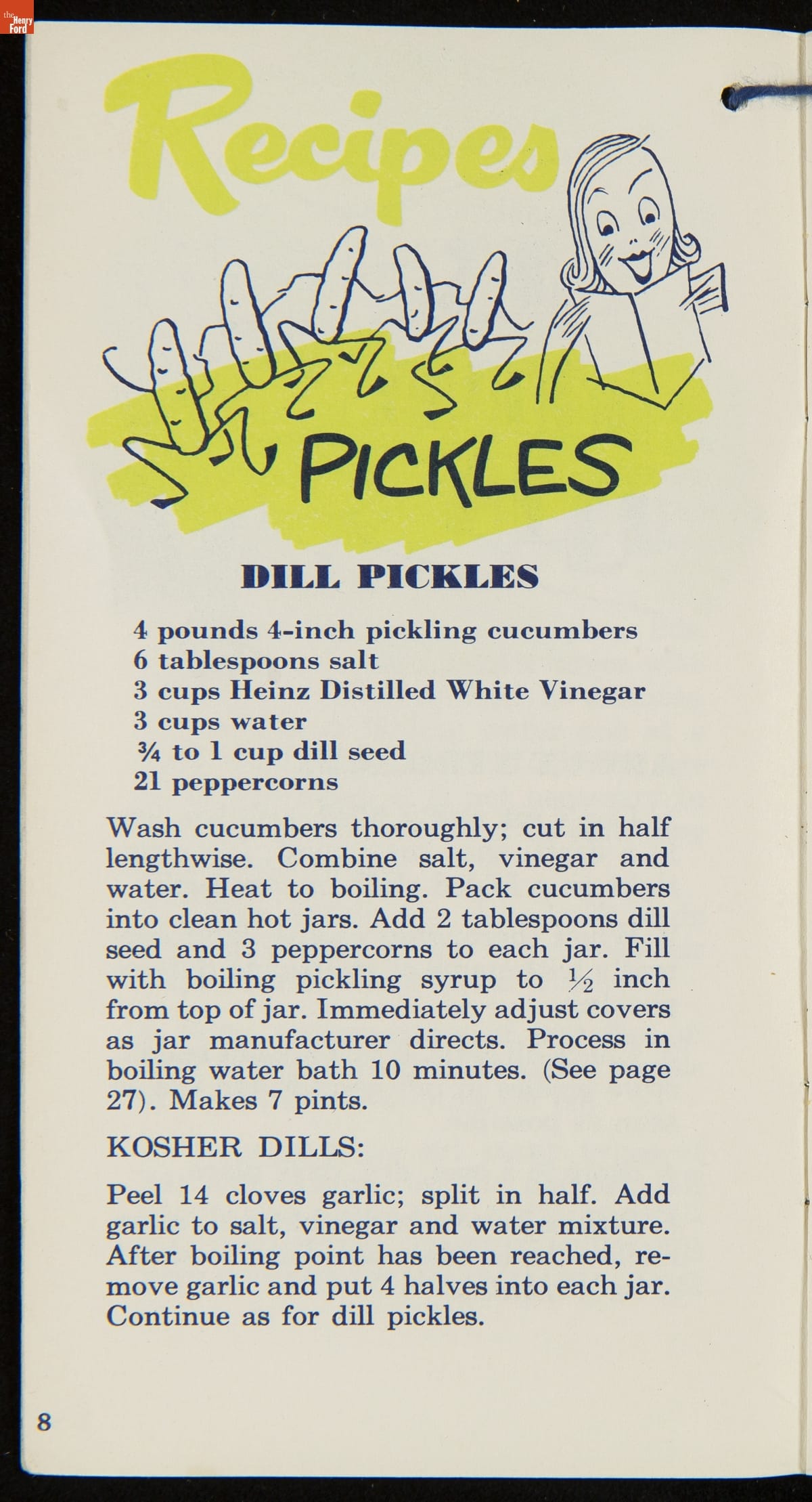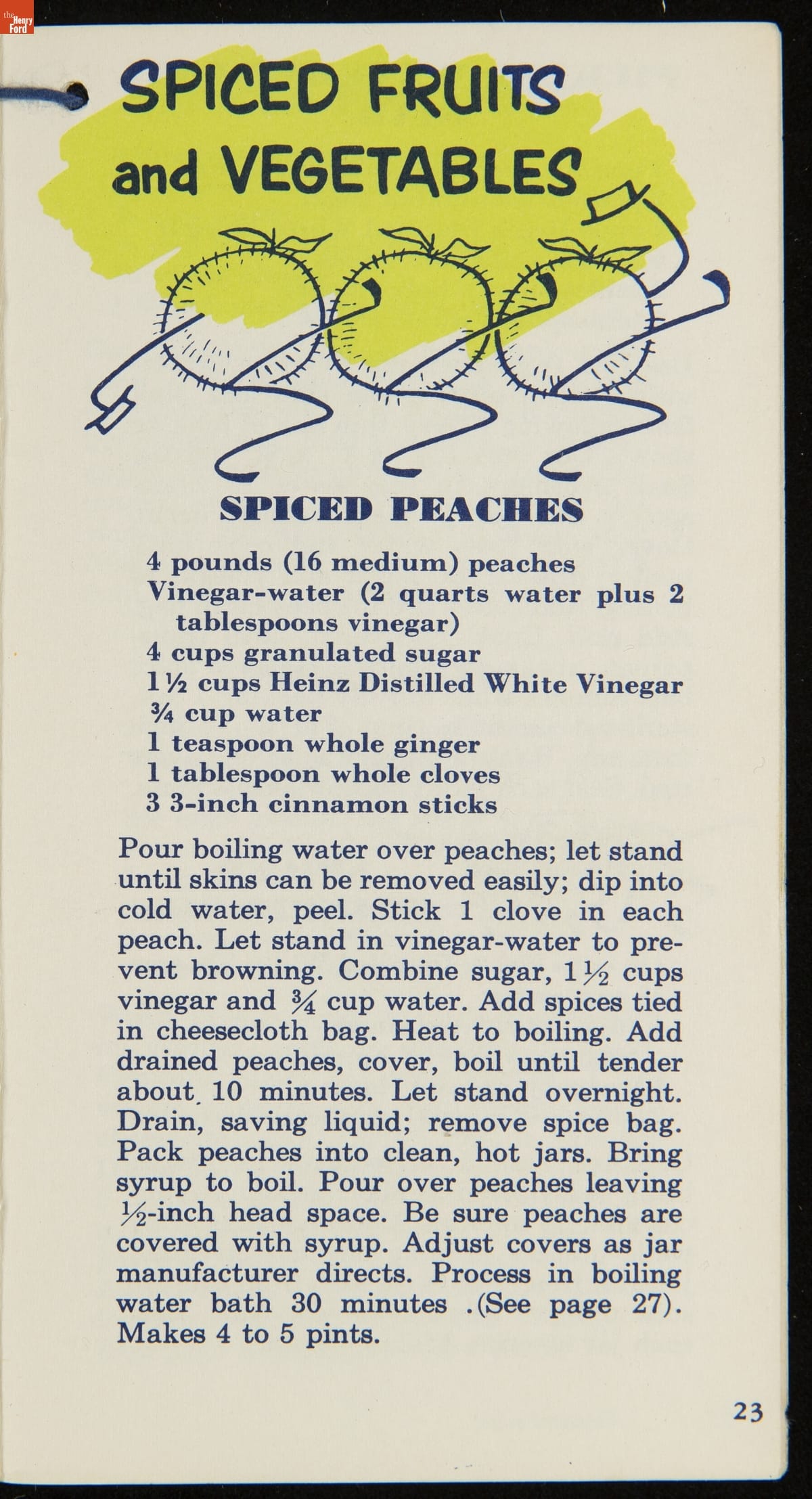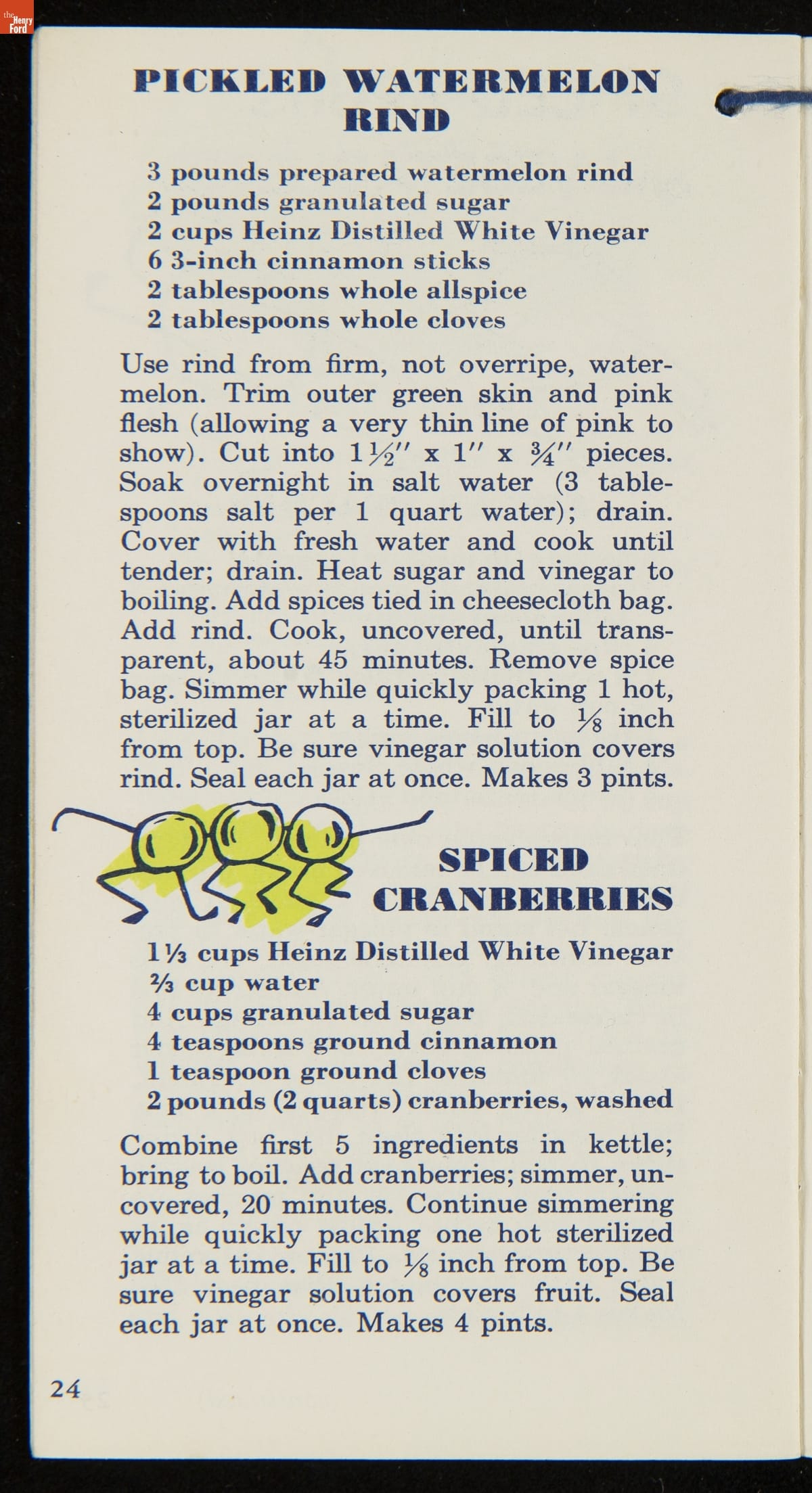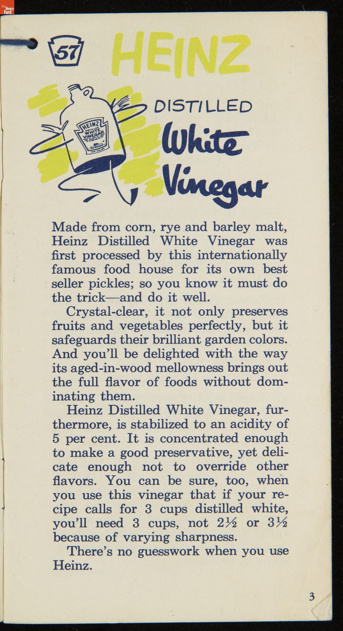 Many manufactured food companies published recipe booklets to promote the use of their products. This booklet published by the H. J. Heinz Company in the 1950s offers homemakers an efficient way to pickle their own products at home. With recipes for making pickles, relishes, and spiced fruits and vegetables, this booklet declares that pickling with Heinz Distilled White Vinegar "is pickling streamlined for modern living!"